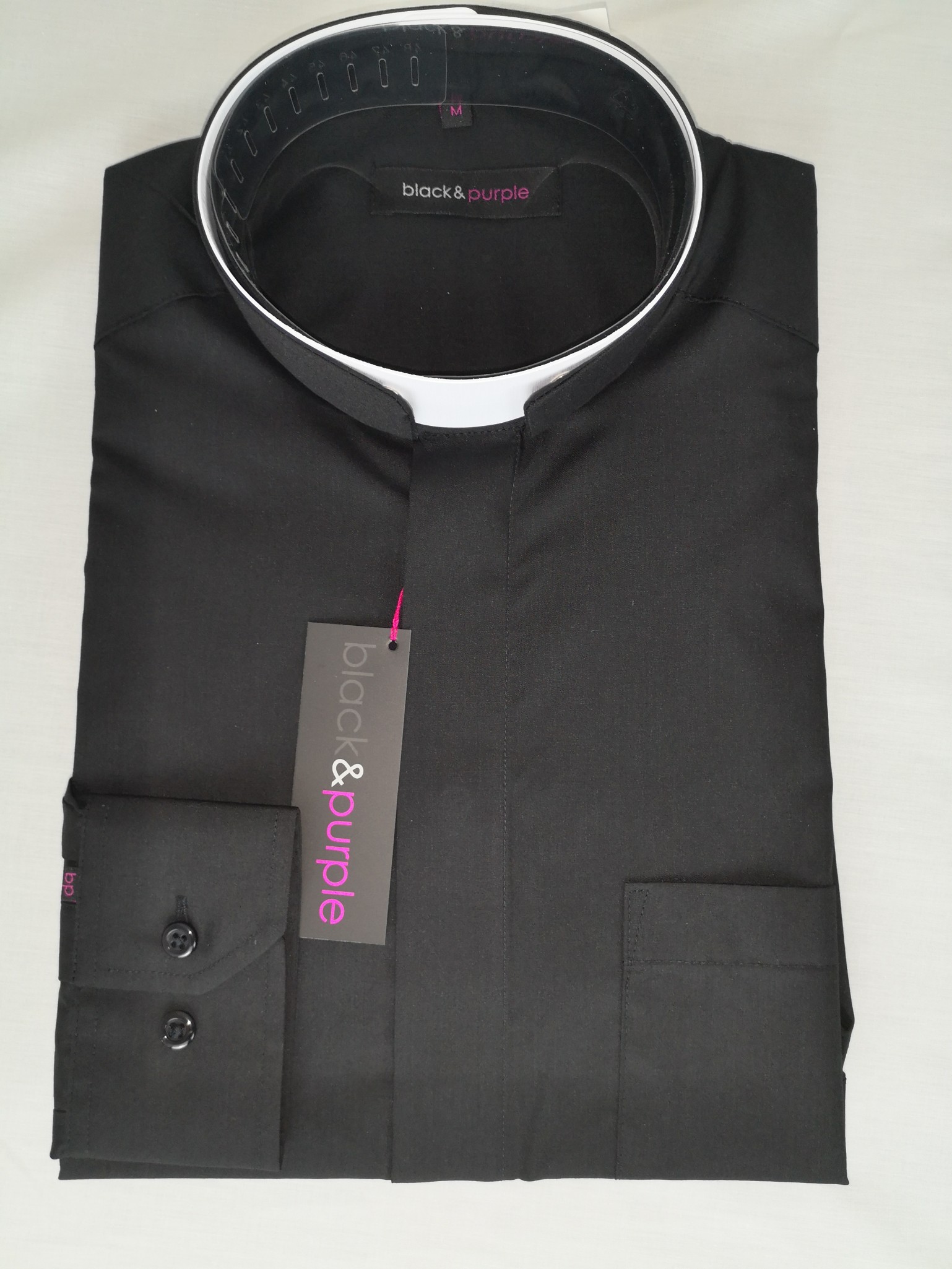 Chemise à col romain mixte polyester (45%) coton (55%) de couleur noire. Taille de la chemise clergyman: 5 XL (équivalent 51 & 52 en tour de cou) Tour de poitrine 156 cm, longueur de manche 70 cm, longueur de chemise 85 cm. Col plastique clergyman fourni et inséré dans le col. Lavable en machine à 40°, repassage facile au fer sur faible température.