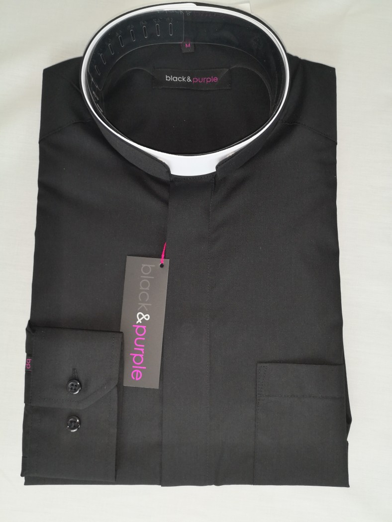 Chemise à col romain mixte polyester (45%) coton (55%) de couleur noire. Taille de la chemise clergyman: XL (équivalent 43 & 44 en tour de cou) Tour de poitrine 128 cm, longueur de manche 66 cm, longueur de chemise 80 cm. Col plastique clergyman fourni et inséré dans le col. Lavable en machine à 40°, repassage facile au fer sur faible température.