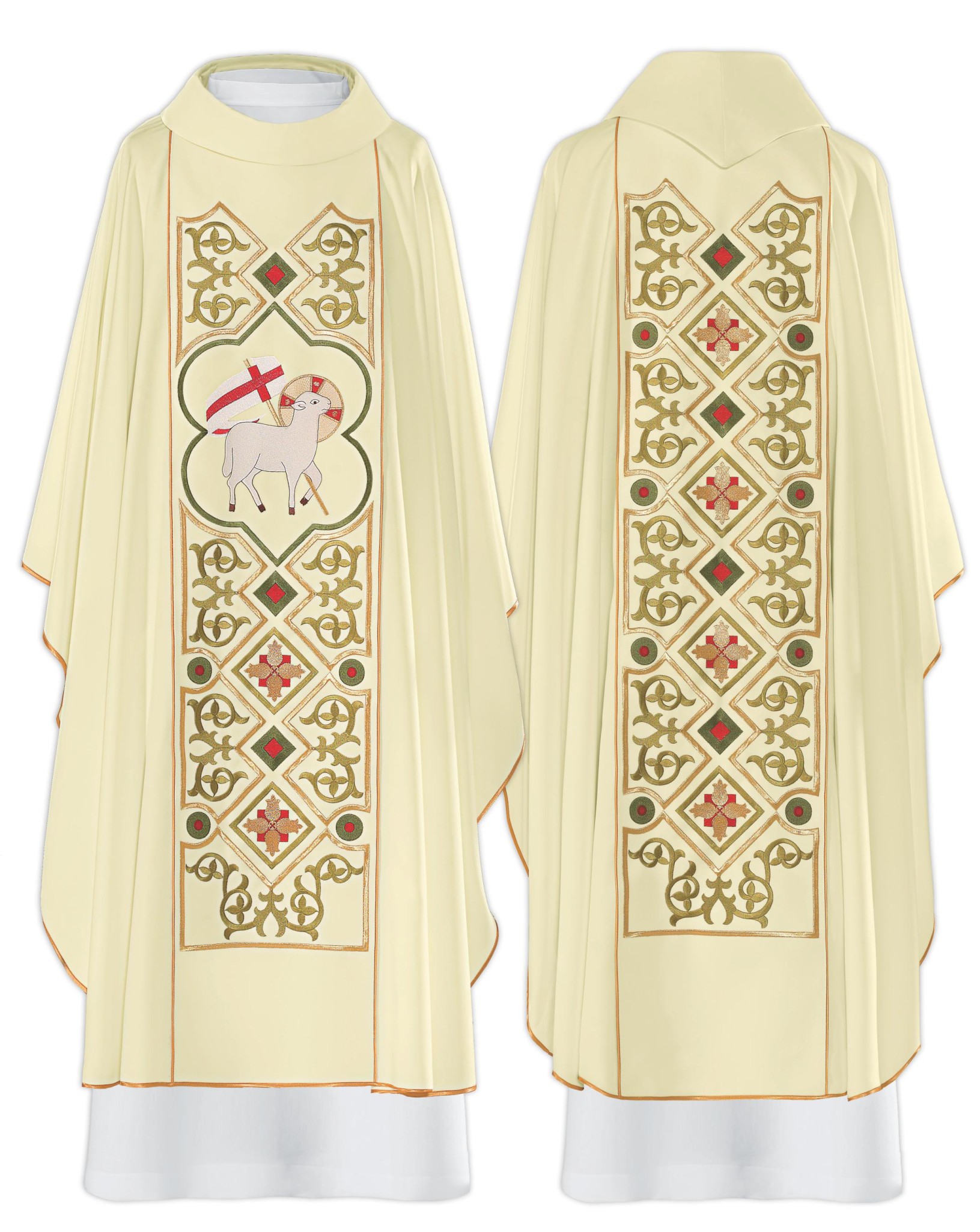 Chasuble banche brodée machine d'un motif agneau pascal ornés de volutes devant, uniquement les volutes sur le dos, en 100 % polyester. Bordée d'un biais sur le bord de la chasuble. Ornement fourni avec son étole. Coupe gothique pour cet ornement brodé : longueur 130 cm, largeur 150 cm.