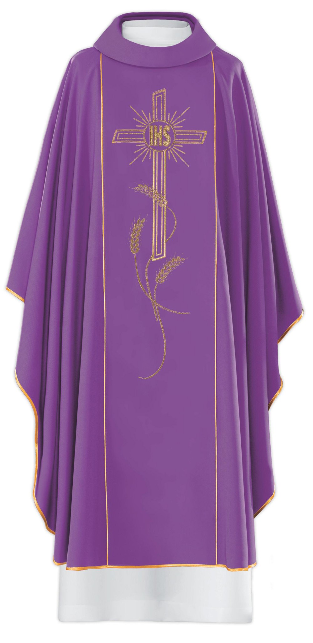 Chasuble violette brodée machine d'un motif croix IHS avec des épis de blé devant et idem au dos sans le IHS, en 100 % polyester. Bordée d'un biais sur le bord de la chasuble. Ornement fourni avec son étole. Coupe gothique pour cet ornement brodé : longueur 130 cm, largeur 150 cm.