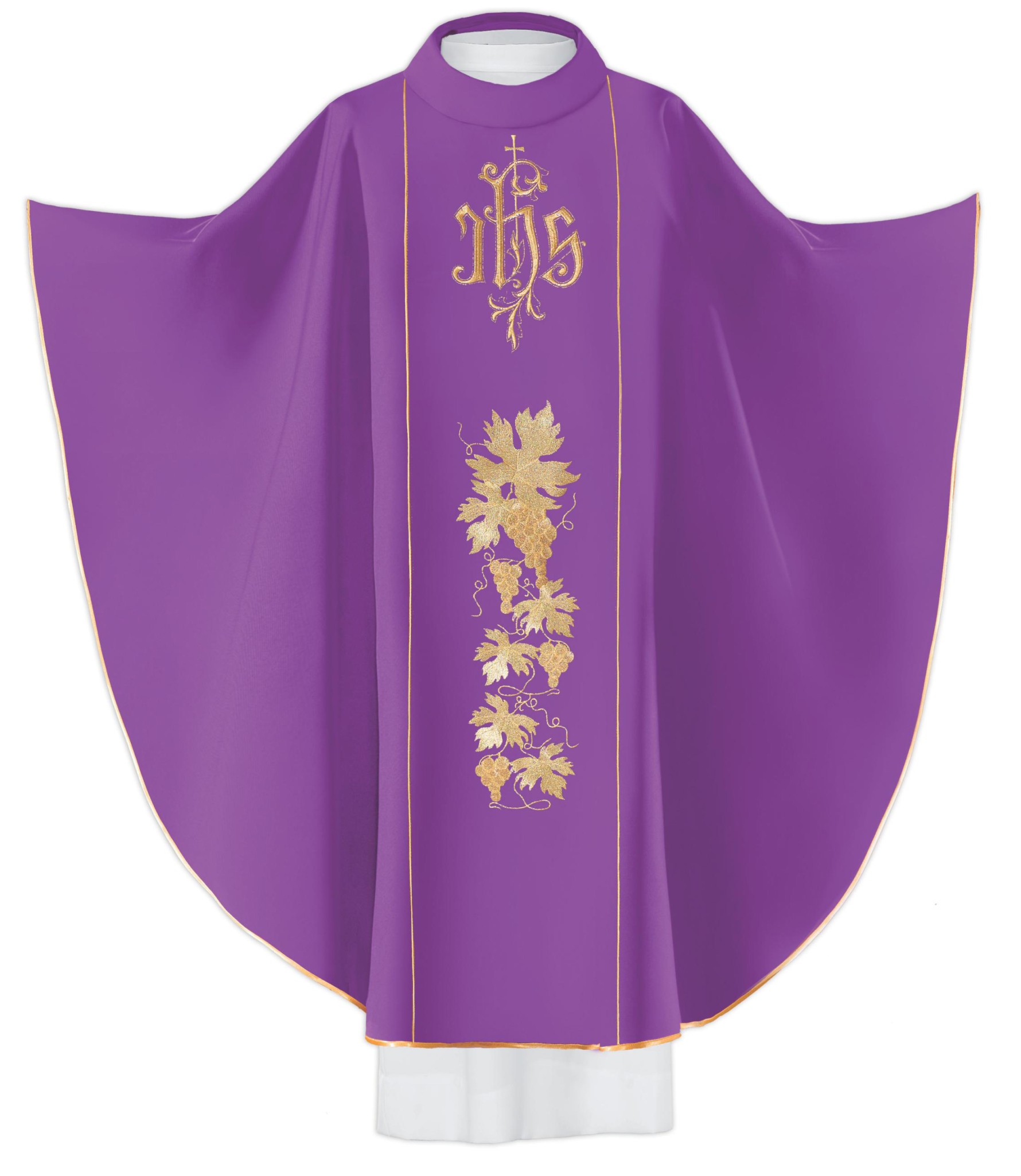 Chasuble violette brodée machine avec un motif IHS et fleurs de vigne devant et dos, en 100 % polyester. Bordée d'un biais sur le bord de la chasuble. Ornement fourni avec son étole. Coupe gothique pour cet ornement brodé : longueur 130 cm, largeur 150 cm.