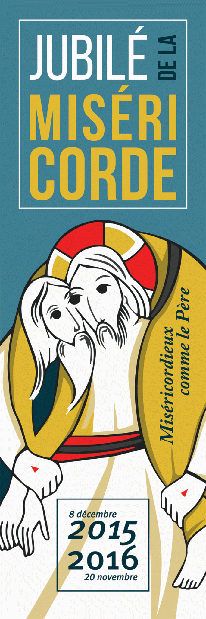 Bannière en tissu (200 g./ m²) au format 1 x 3 mètres de long. Pour solenniser le jubilé de la miséricorde. Finie d'un ourlet ouvert en haut avec une barre avec pommeaux en bois et cordon de suspension.