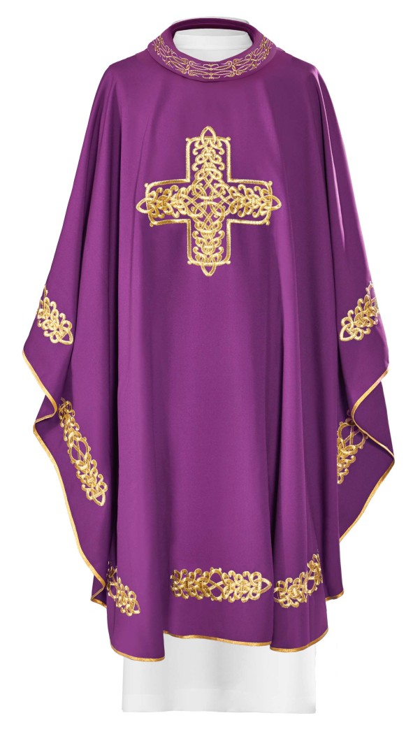 Chasuble violette brodée machine ornée d'une croix en son centre et de décoration sur le bord. Chasuble brodée en 100 % polyester. Bordée d'un biais sur le bord de la chasuble. Ornement fourni avec son étole. Coupe gothique pour cet ornement brodé : longueur 130 cm, largeur 150 cm.