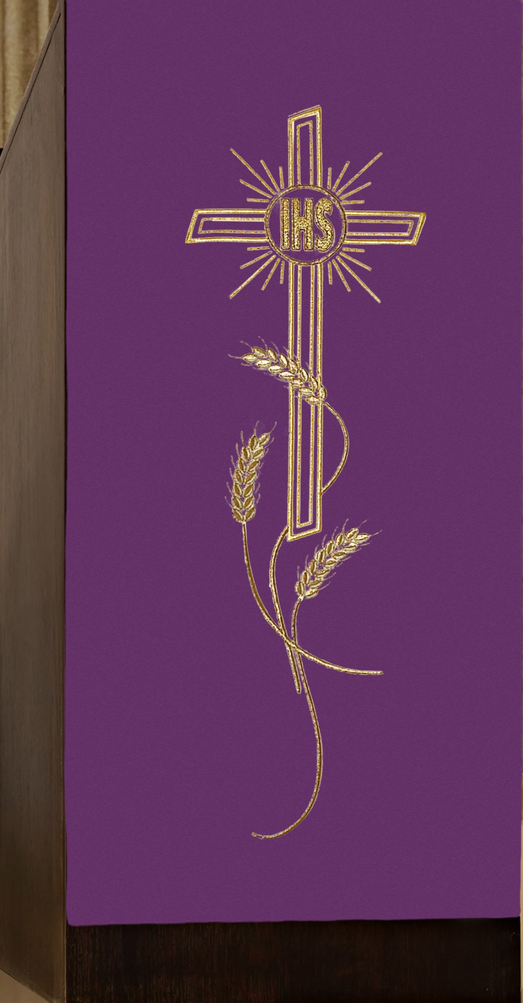 En polyester brodé machine d'une croix et d'un épi de blé, dimensions 55 cm de large, 2,50 m de longueur.