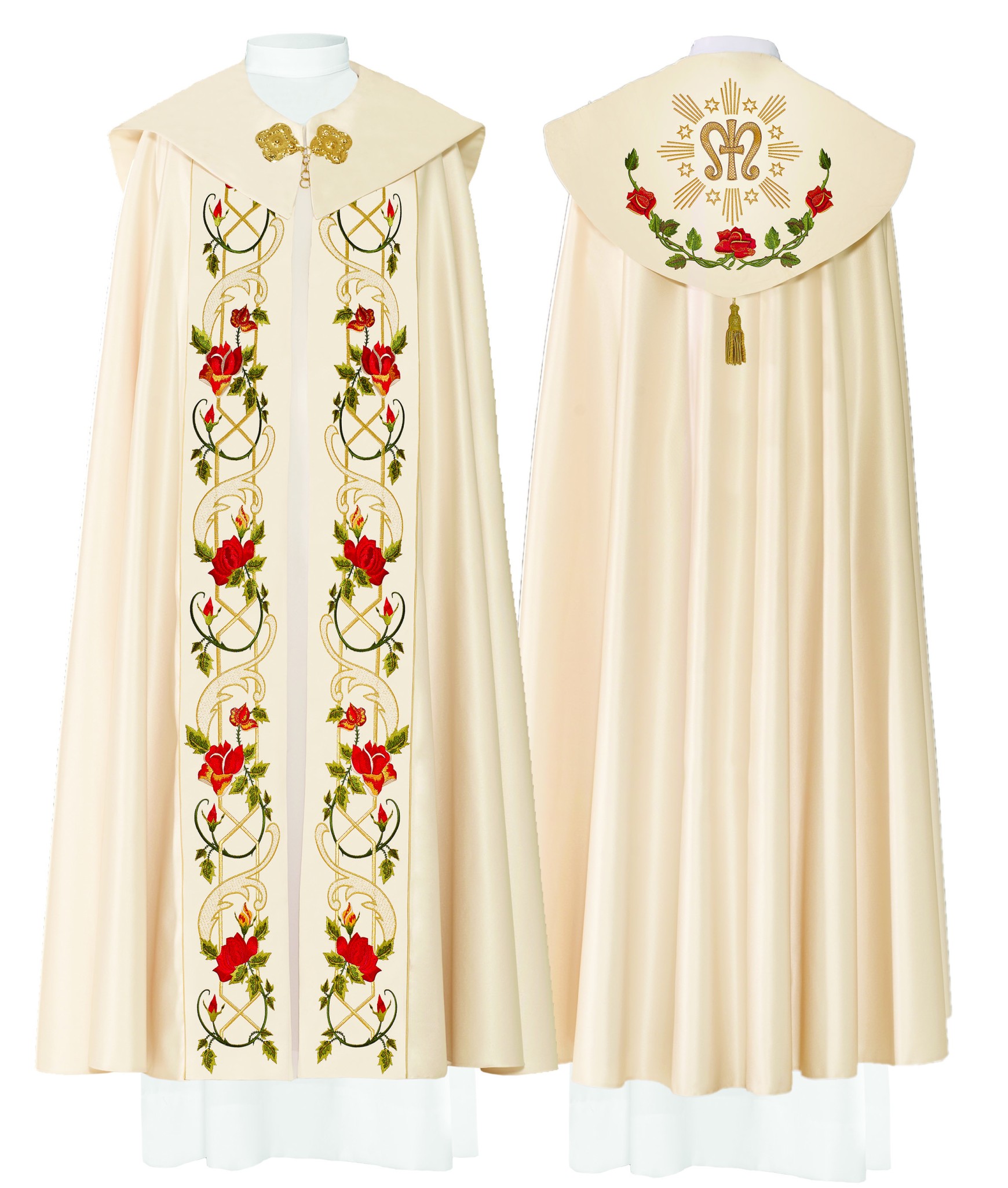 Chape en polyester brodée devant et dos. Un MA orne le capuchon, des volutes ornent le devant. Longueur de l'ornement 145 cm. Chape fournie avec son étole.