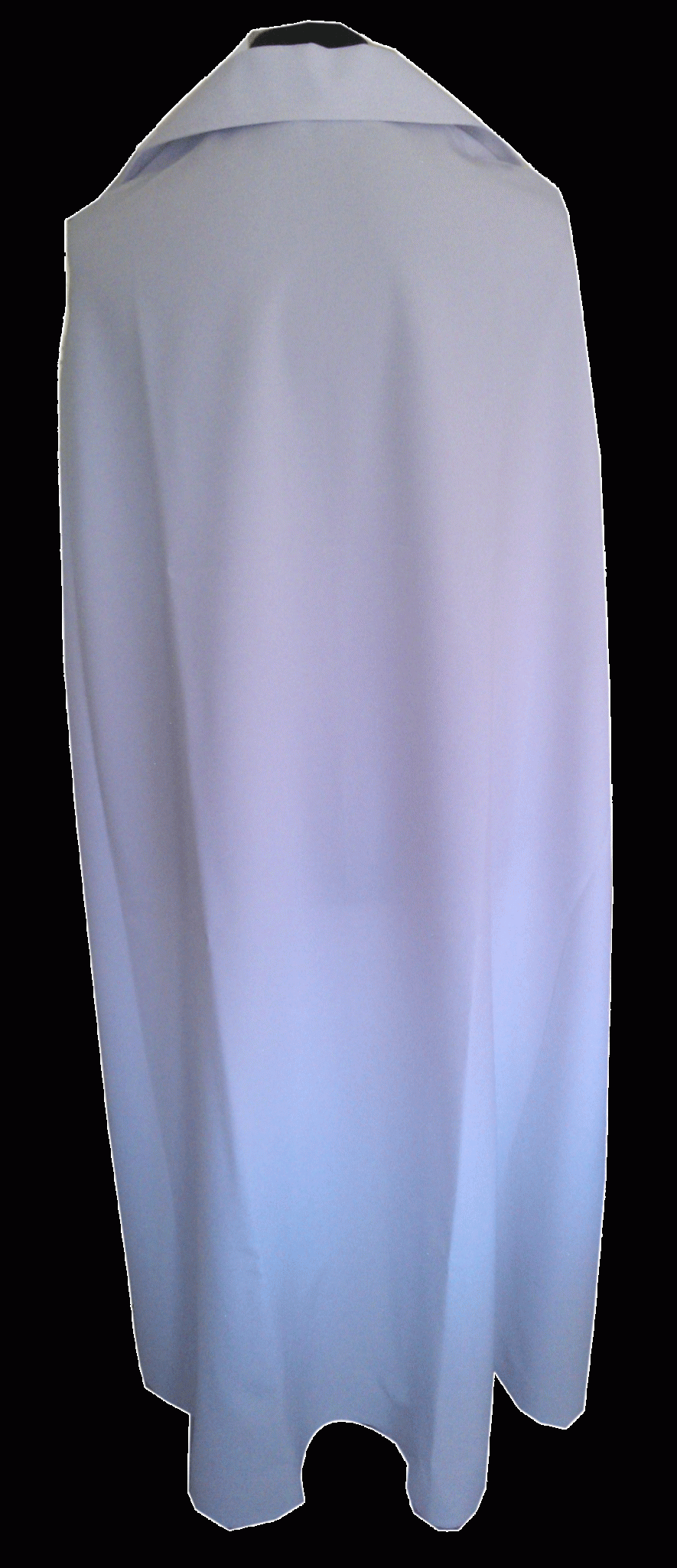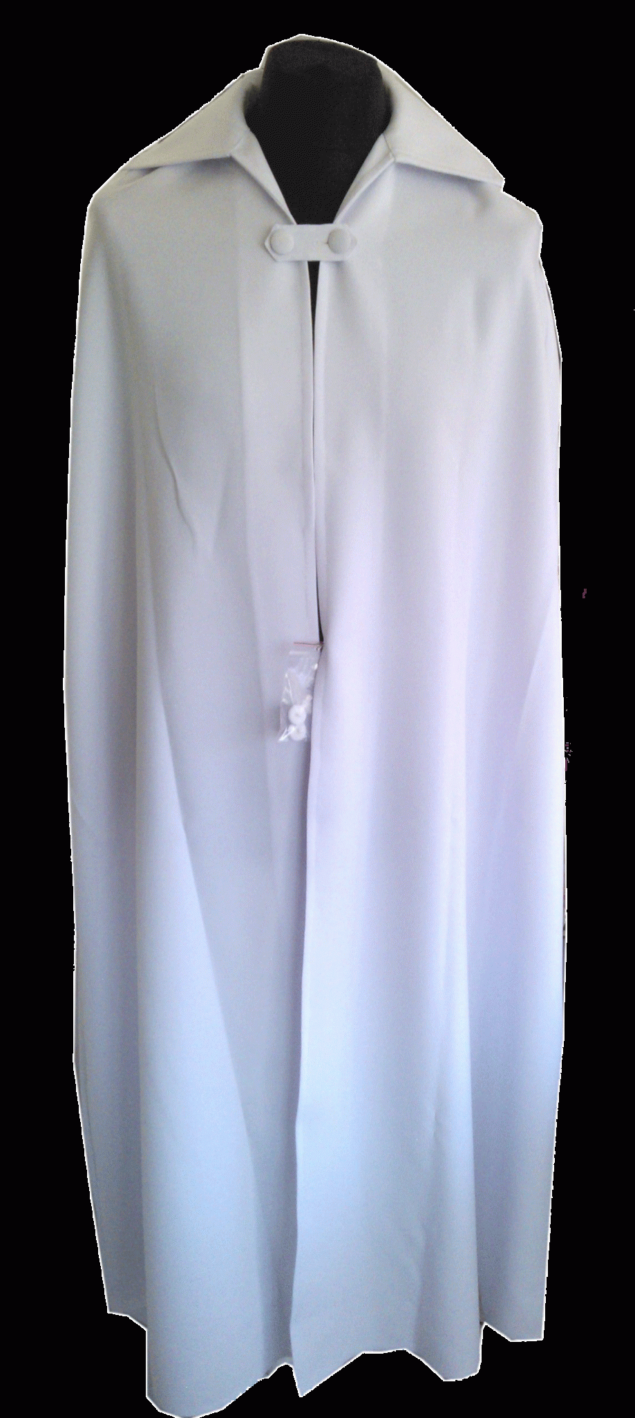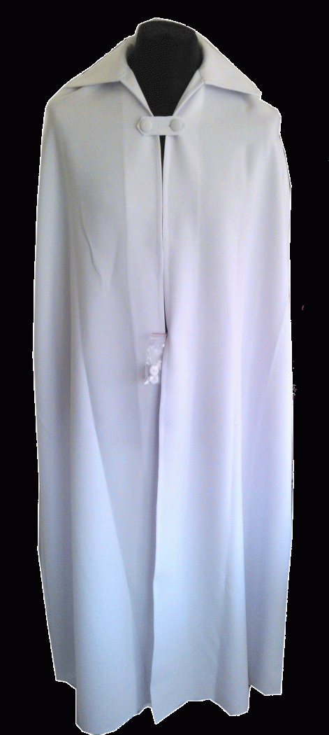 Une cape de catéchumène d'une longueur 90 cm. Pour symboliser le vêtement blanc remis lors d'un baptême d'adulte. En 100 % polyester blanc, pratique à enfiler avec une attache à bouton sur le devant. Prévoir environ une cape mesurant 25 à 30 cm de moins que la taille de la personne.