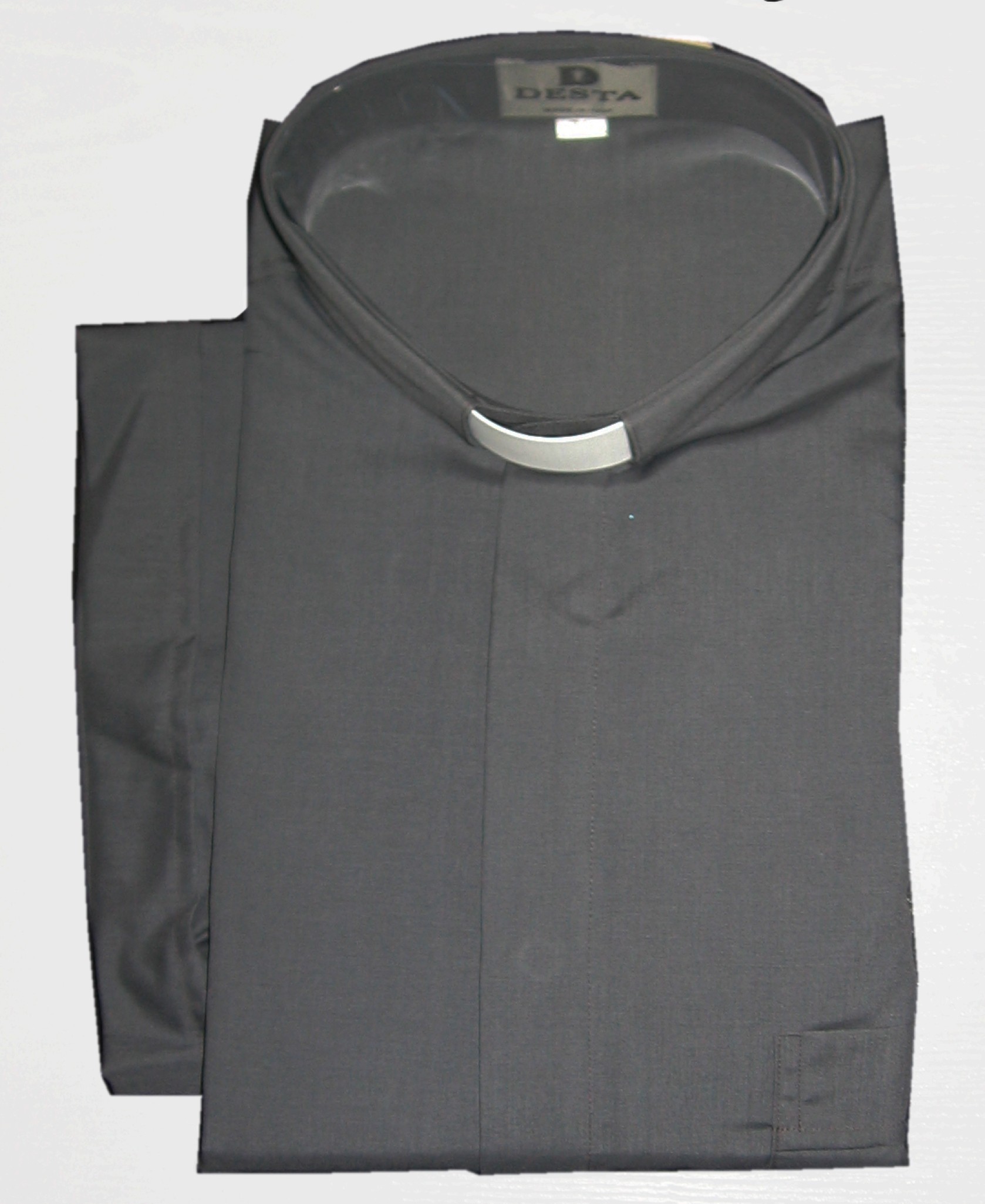 Chemise clergyman mixte polyester (45%) coton (55%) de couleur gris anthracite. Taille de la chemise clergyman: 5XL (équivalent 51 & 52 en tour de cou) Tour de poitrine 156 cm longueur de chemise 85 cm. Col plastique clergyman fourni et inséré dans le col. Lavable en machine à 40°, repassage facile au fer sur faible température.