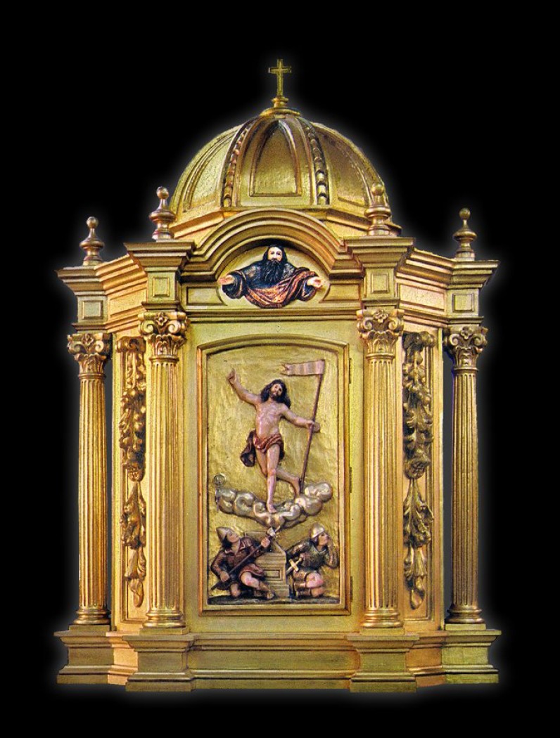 Tabernacle en bois réalisé à la main par un artisan espagnol. Doré et sculpté sur bois avec un Christ ressuscité sur la porte. Des colonnes et des moulures ornent le tabernacle.