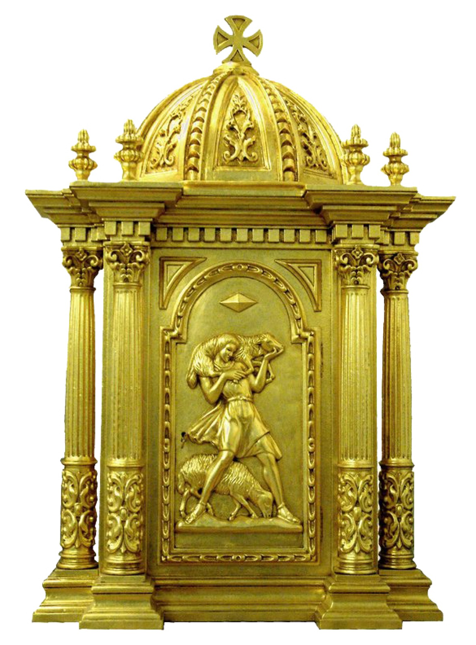 Tabernacle en bois réalisé à la main par un artisan espagnol. Doré et sculpté sur bois avec le bon pasteur sur la porte. Des colonnes et des moulures ornent le tabernacle.