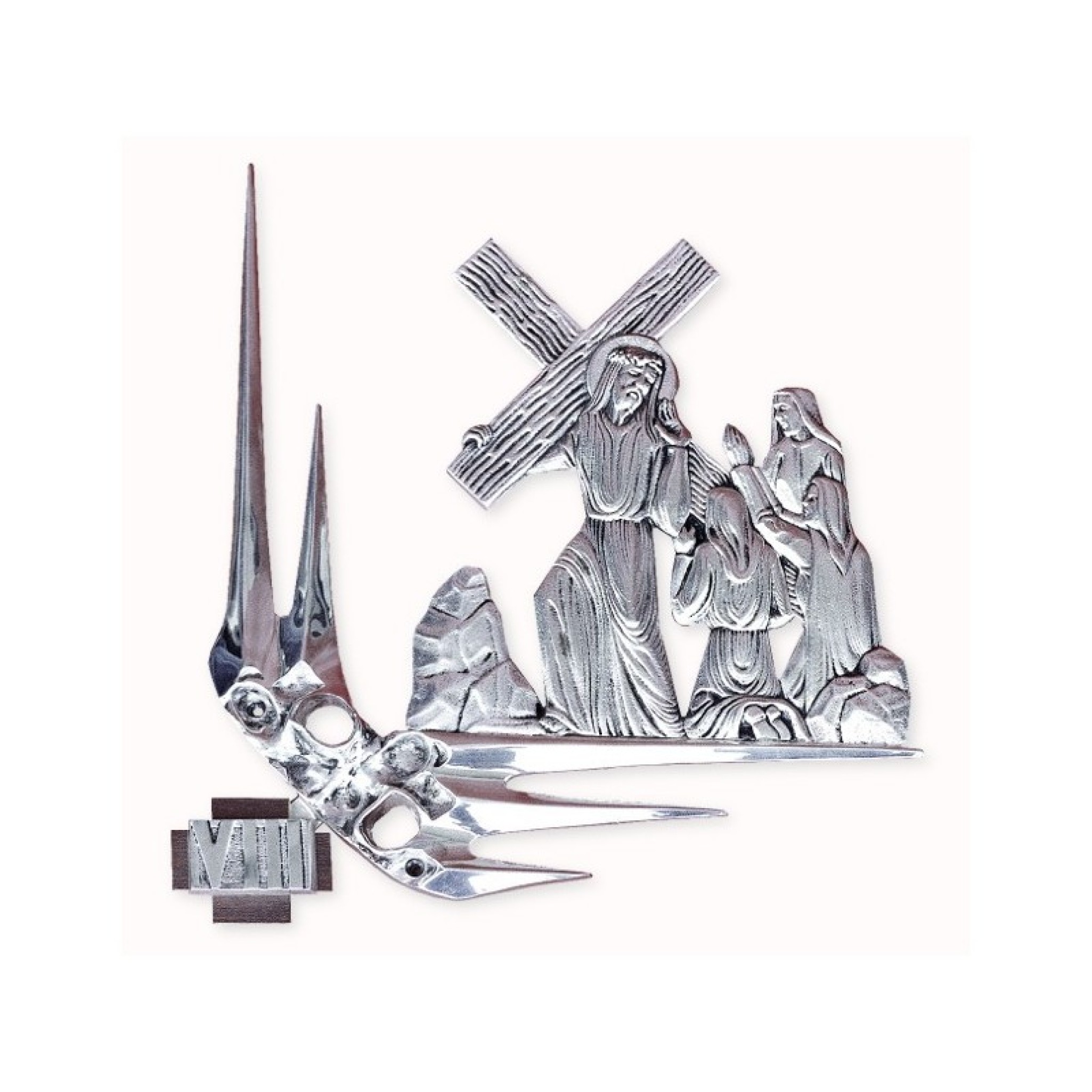 Chemin de croix de 15 stations en fusion de laiton argenté avec base en bois. Dimensions de chaque station du chemin de croix : larg. 32 cm - long. 34 cm. Disponible en doré sur demande.