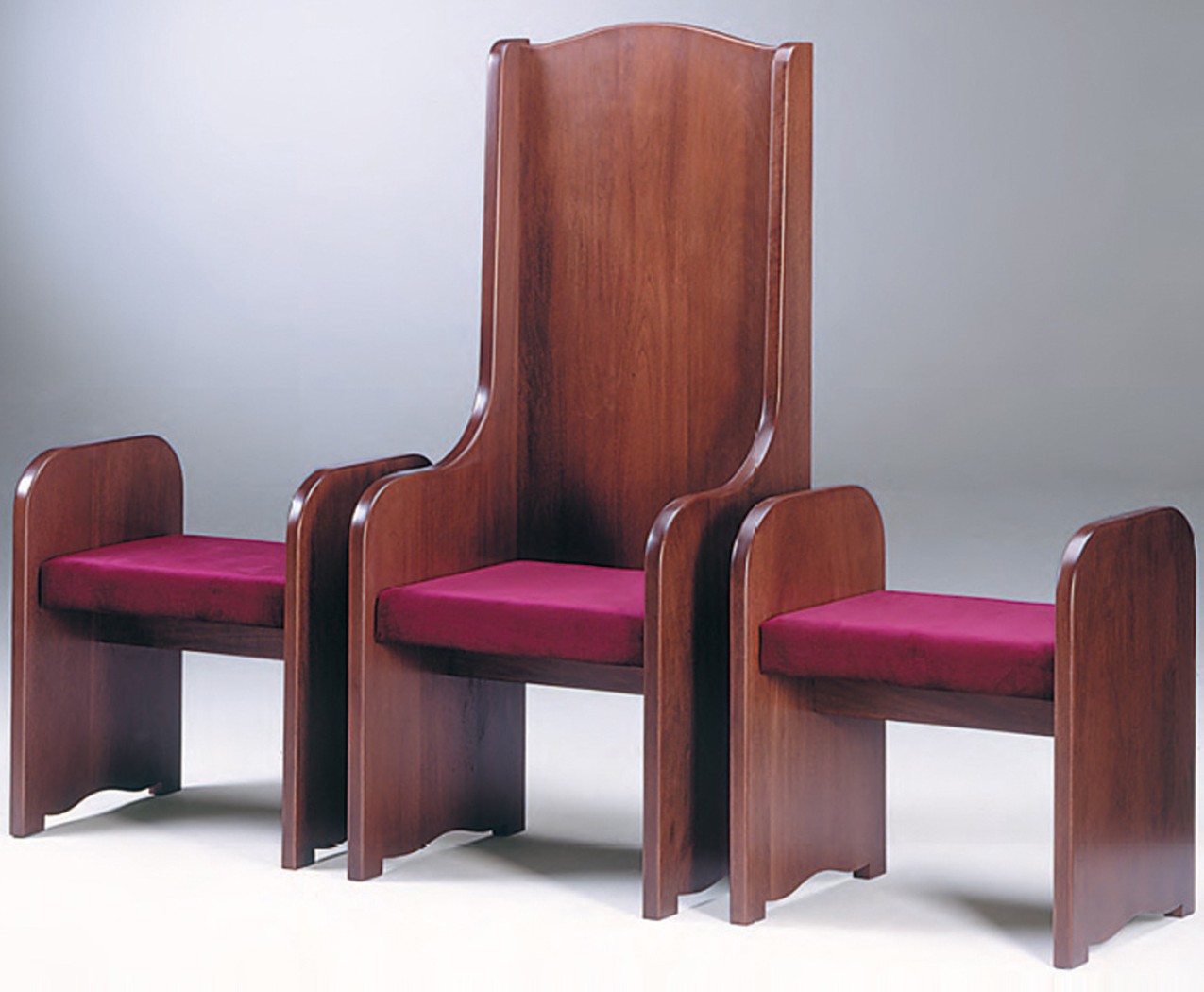 Ensemble de présidence en hêtre teinte noyer moyen, style classique. Comprenant un fauteuil aux dimensions : haut. 140 cm, larg. 57 cm., prof. 51. Hauteur d'assise 47 cm.
