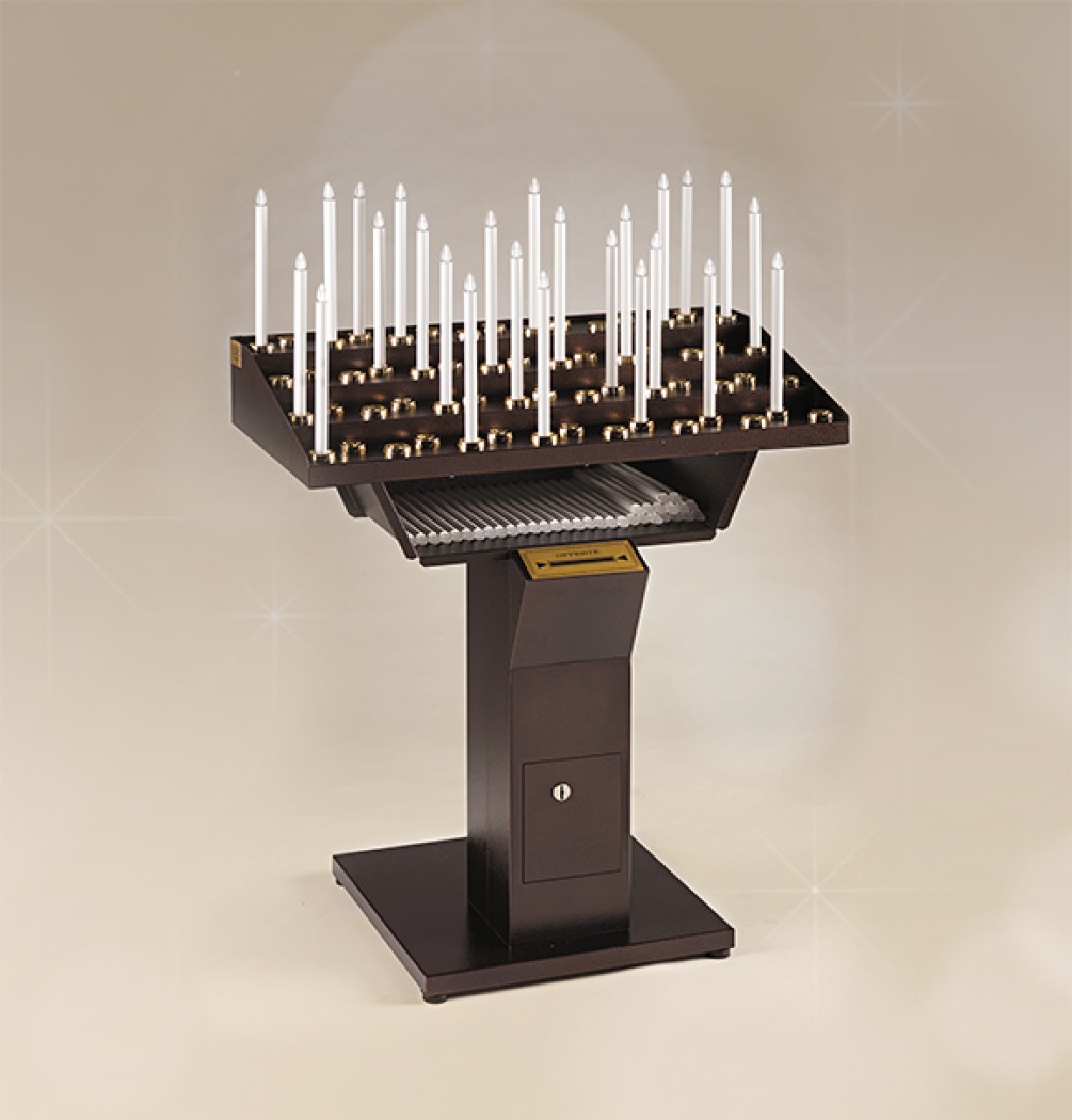 Brûloir électrique, fourni avec 60 cierges à ampoule. Le meuble comprend un tronc blindé avec système contre le retour des pièces ou billets.
