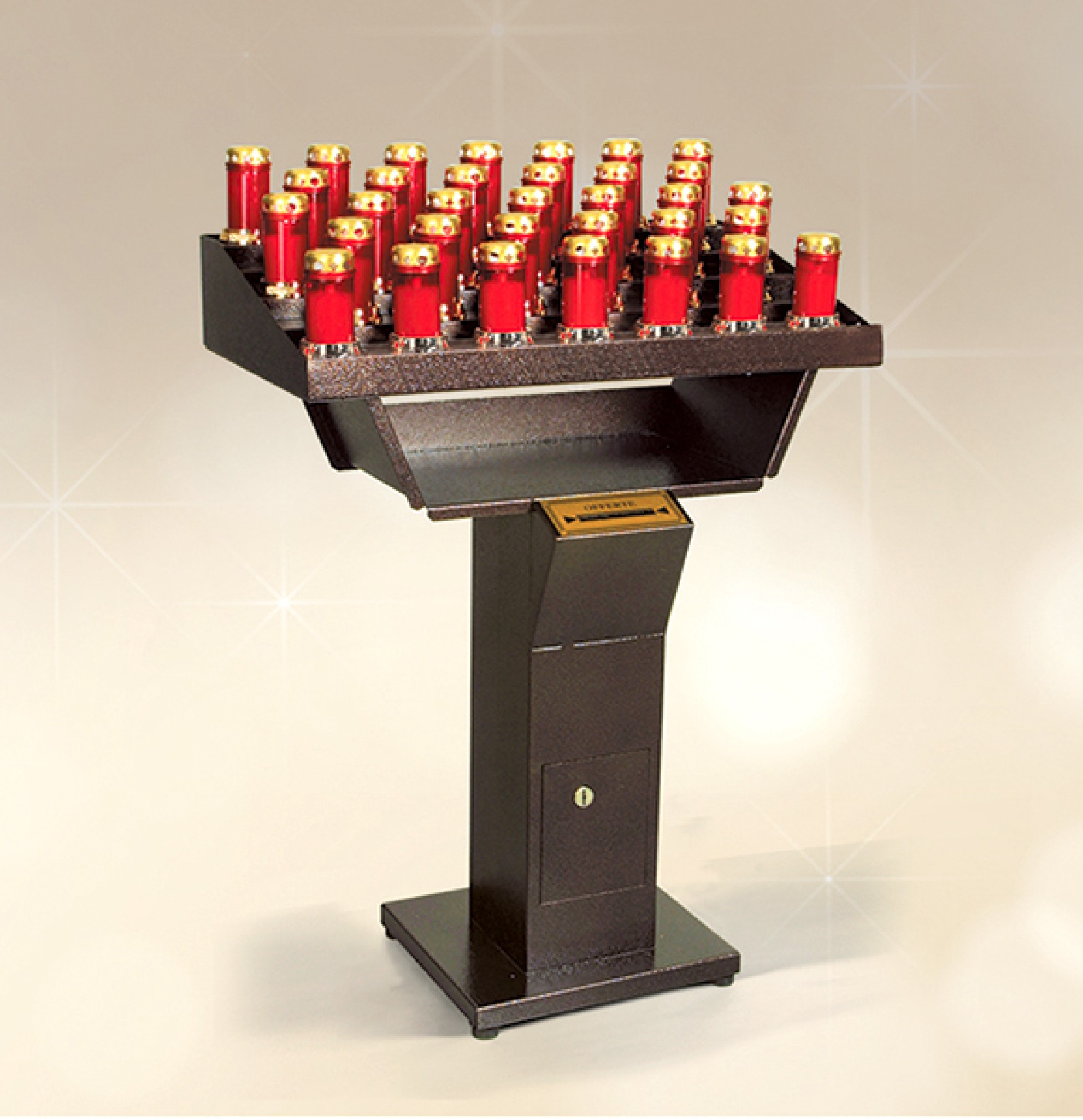 Brûloir électrique, fourni avec 60 veilleuses à ampoule à arrêt automatique programmable au bout de 1 ou 3 heures. Le meuble comprend un tronc blindé avec système contre le retour des pièces ou billets.