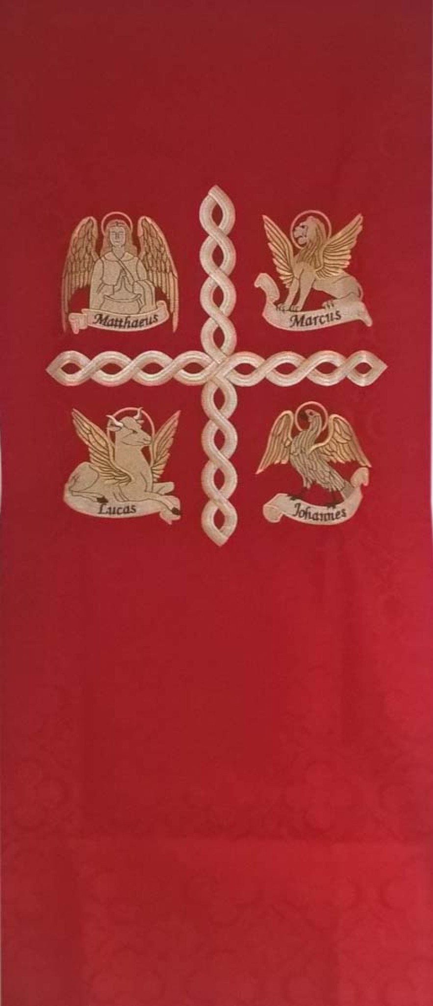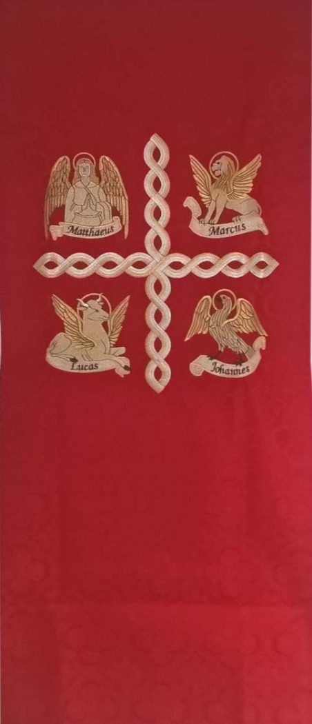 En polyester damassé brodé machine et orné des quatre évangélistes, dimensions 55 cm de large, 2,50 m de longueur.