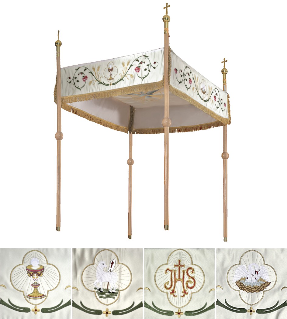 Dais en tissu 100 polyester résistant, orné de broderies et de franges (souples non métallique) sur ses quatre faces. Une face ornée d'un calice, d'un agneau pascale, d'un IHS et d'un pélican. L'intérieur est orné d'une colombe. Dimensions du dais 130 x 160 cm. Fourni avec les hampes.