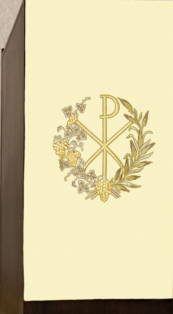 En polyester brodé machine d'un Chrisme entouré de feuilles de vigne et d'épis de blé, dimensions 55 cm de large, 2,50 m de longueur.