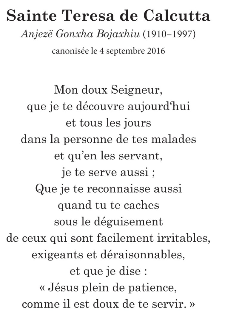 Une belle image pour la canonisation de Mère Térésa au format 7 x 10.5 cm. Imprimée sur carton 350 g., avec pelliculage brillant. Au verso, une belle prière de Mère Térésa. Lot de 50. Possibilités par 250 ou par 1000 avec prix dégressifs.