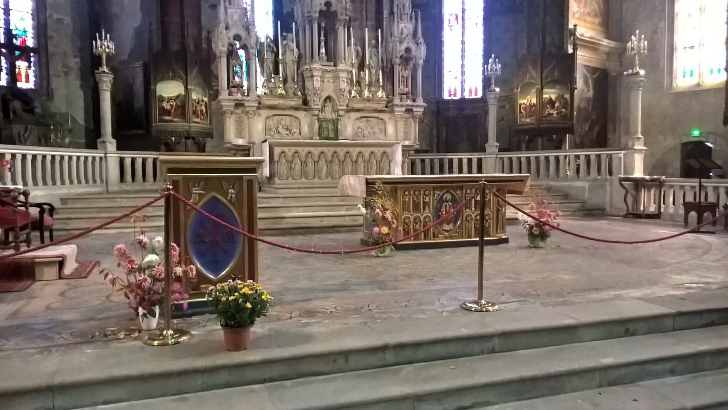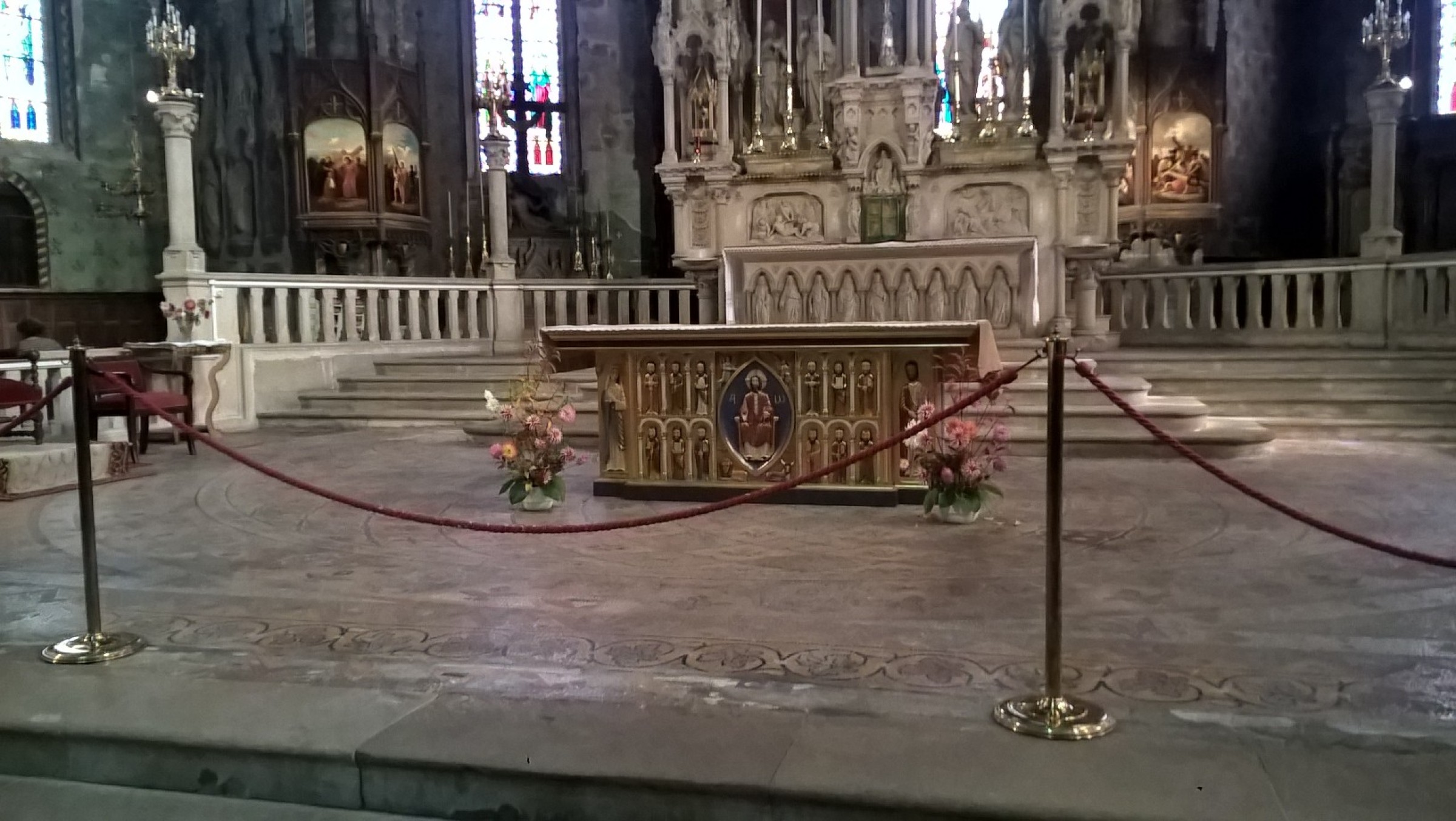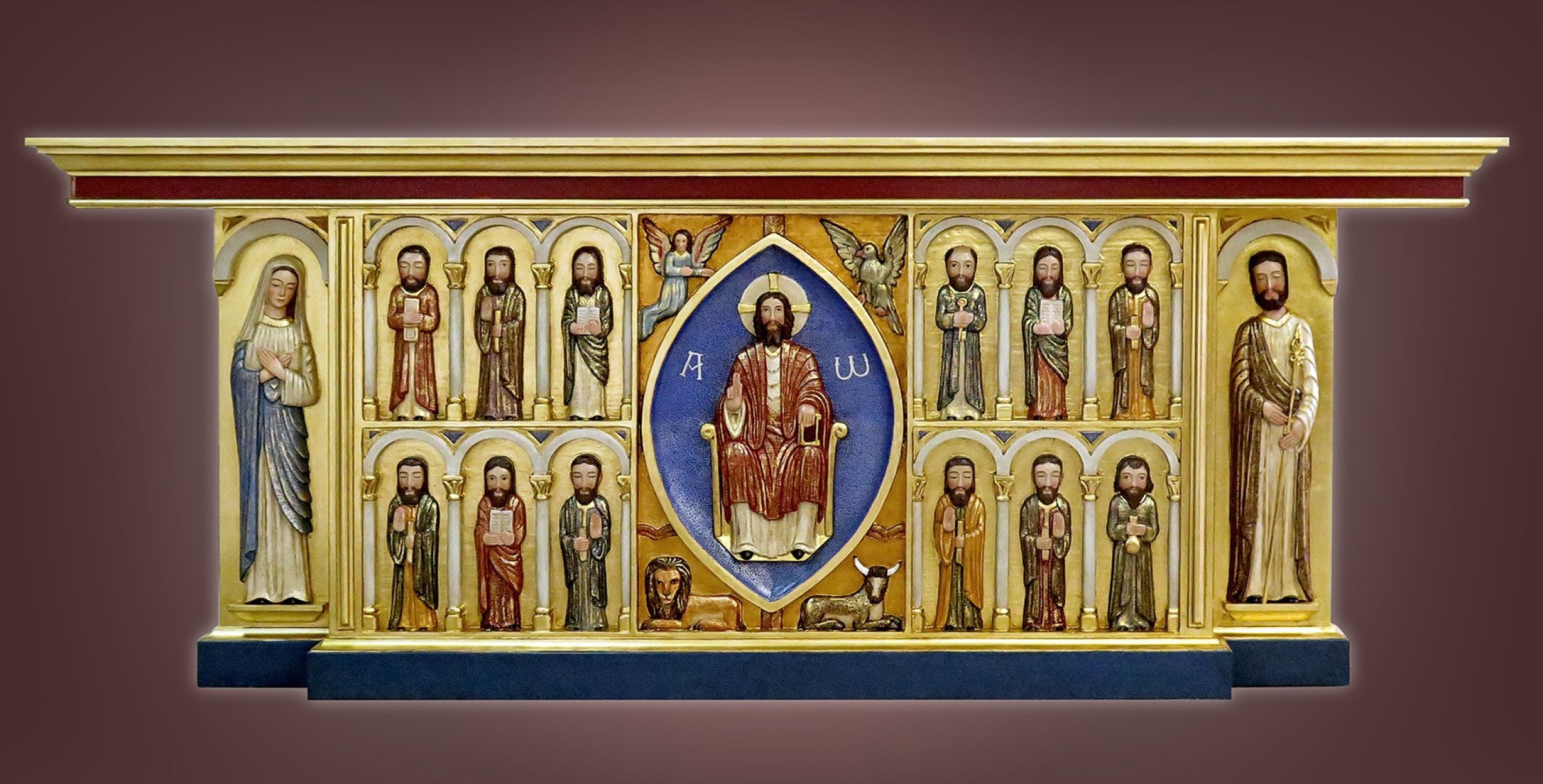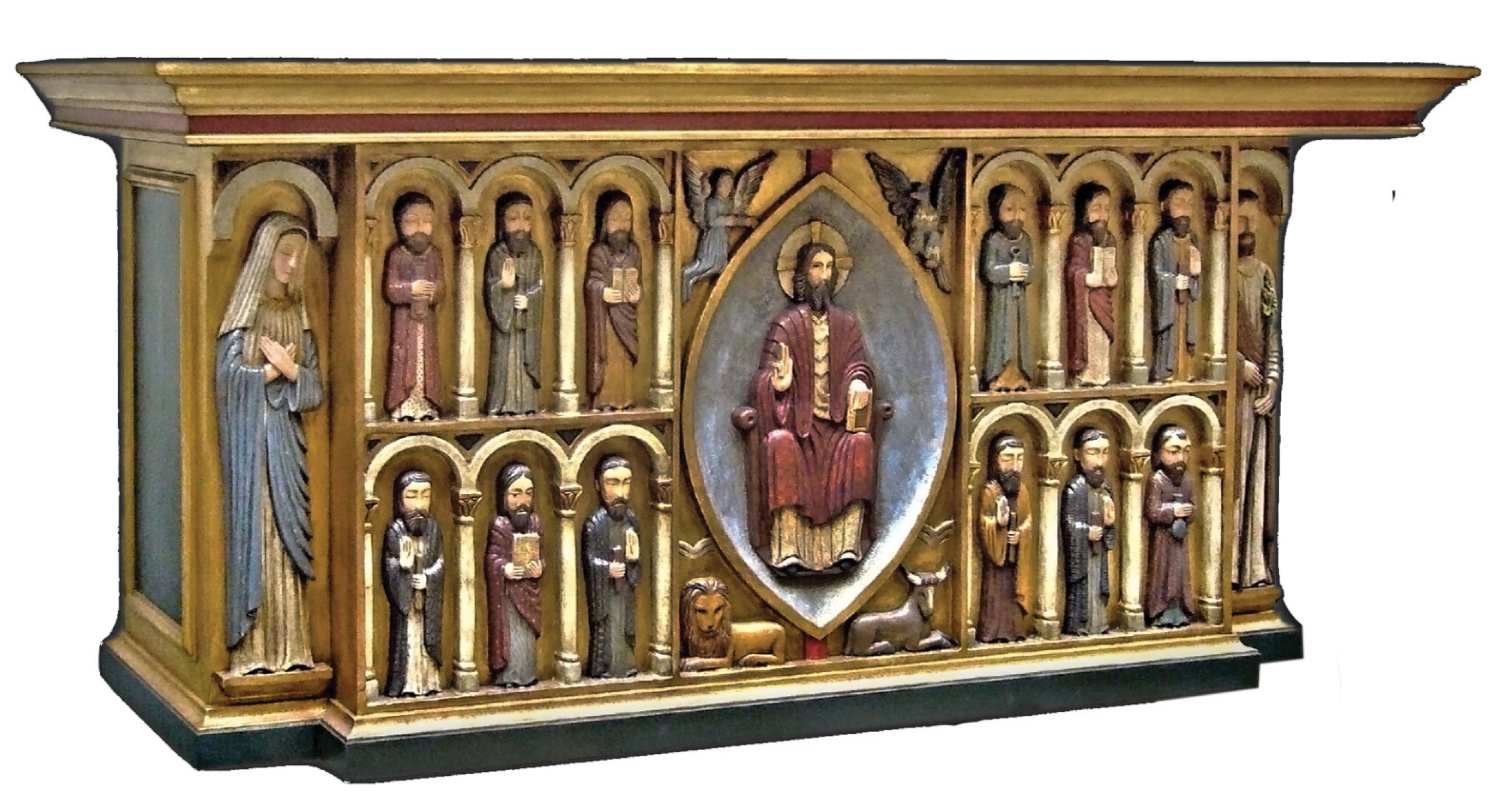 Un autel en bois de style roman avec un bas relief représentant le Christ en gloire avec le tétramorphe des quatre évangélistes. Les douze apôtres de chaque côté et la vierge Marie et Saint Joseph à chaque extrémité. Magnifiquement peint à la main. Cet autel a été produit avec un ambon assorti et installé à la cathédrale Saint Maurice de Mirepoix.