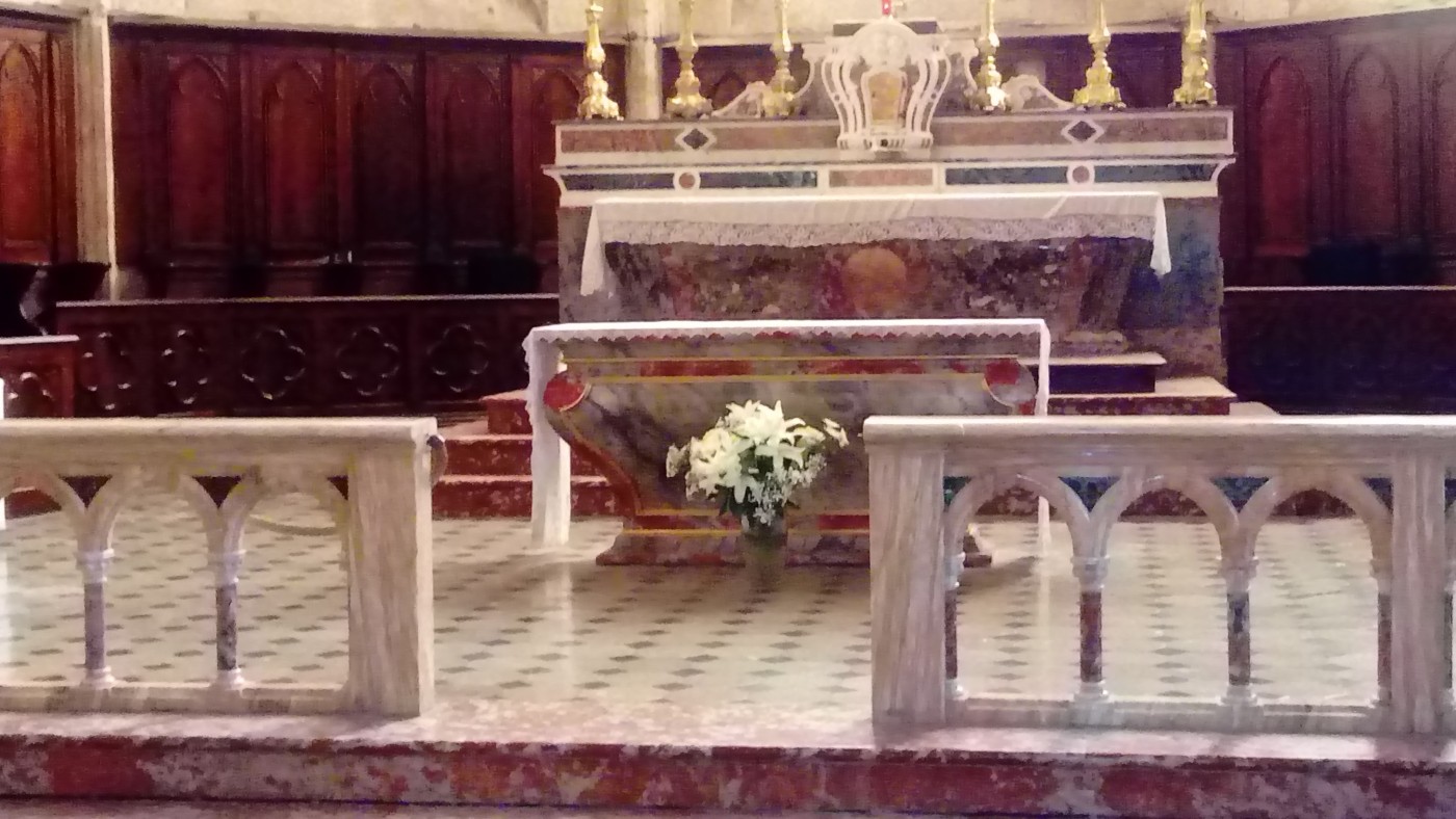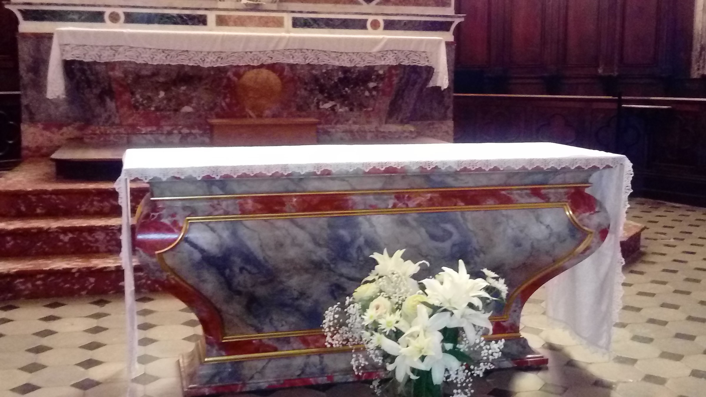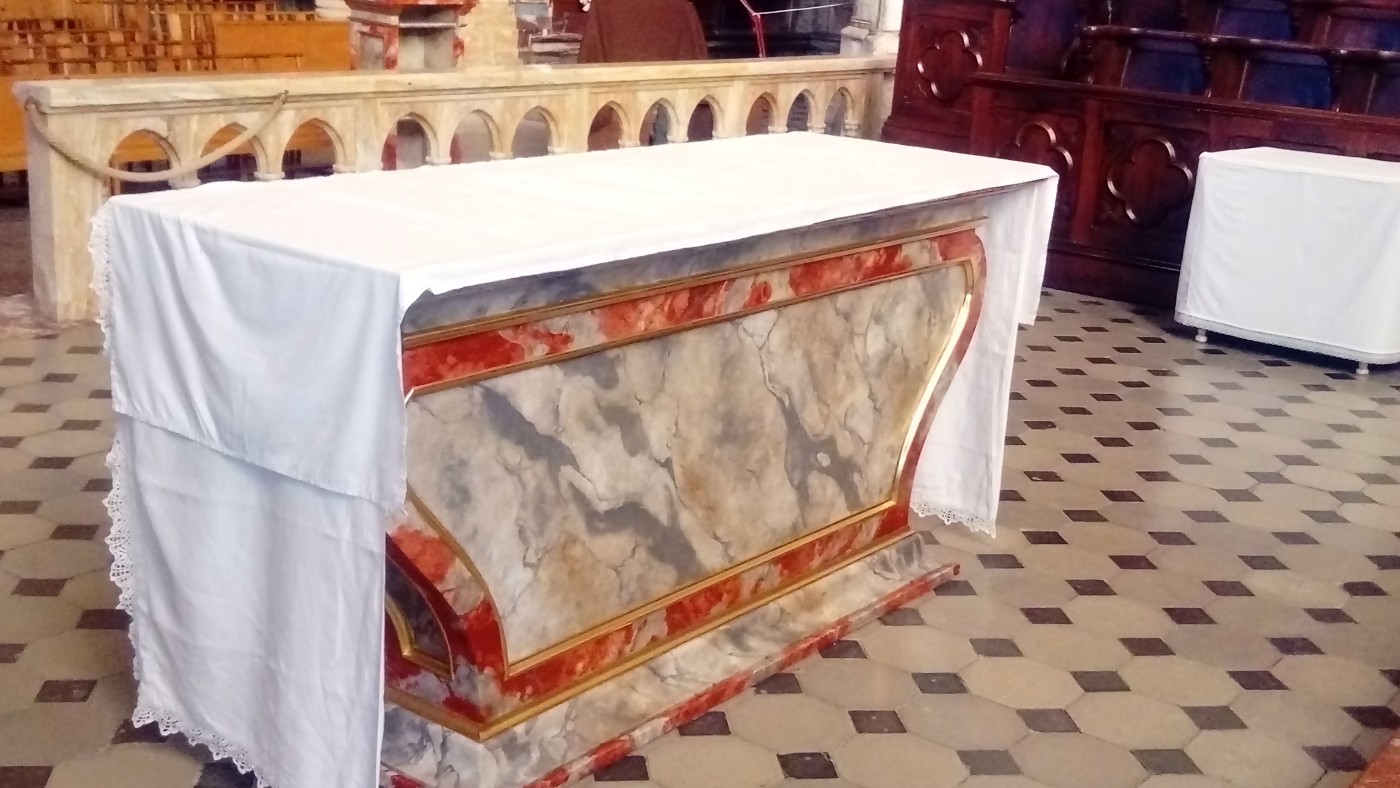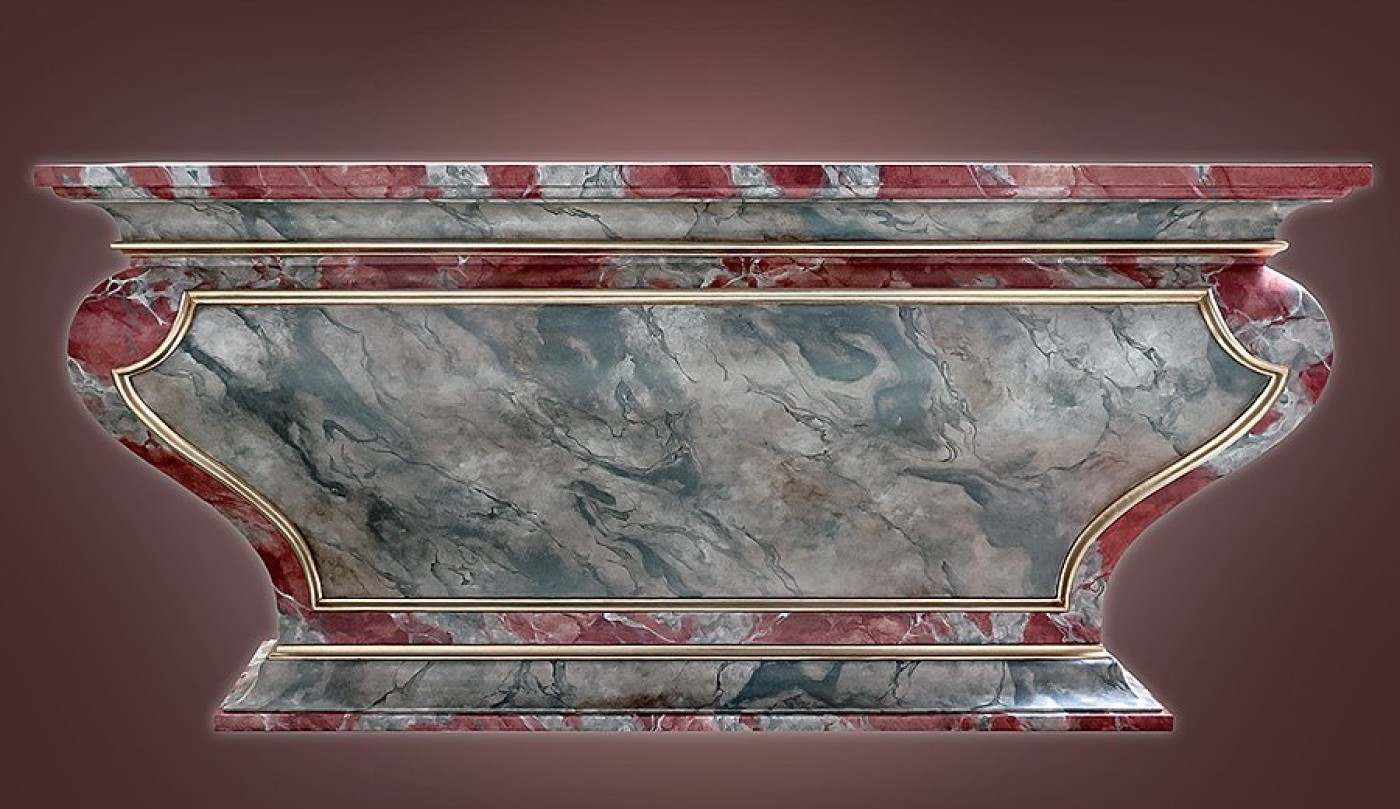 Autel en bois, style XVIII e assorti au maître autel et au choeur de Saint-Etienne de Capestang. Peinture en imitation faux marbre disponible dans toutes les teintes. Nous consulter.