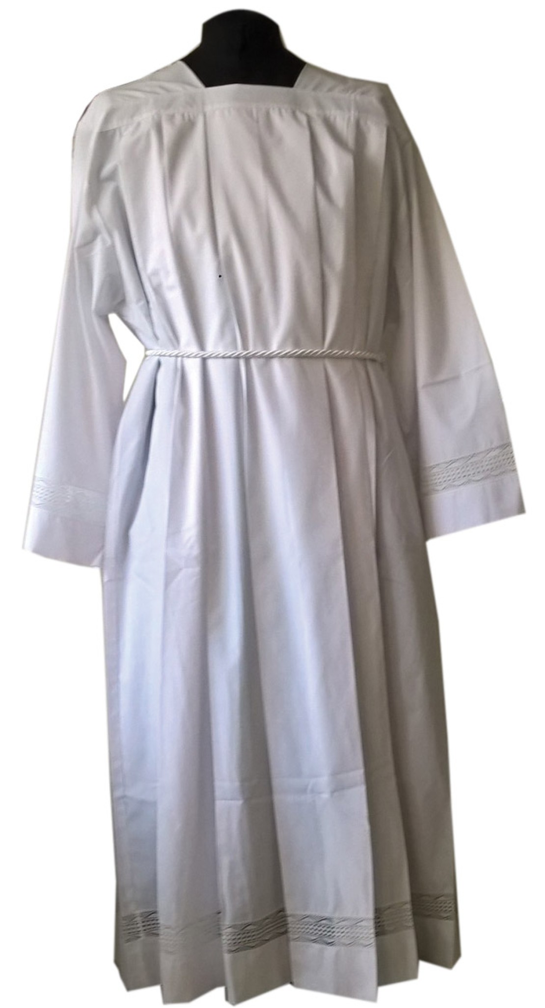 Aube liturgique en mixte polyester (65%) et coton (35 %), blanche avec encolure carrée et un entre-deux aux manches et sur le bas de l'aube. Long. de l'aube romaine 140 cm.