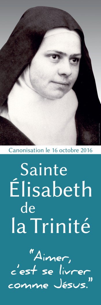 Bannière en tissu (200 g./ m²) au format 1 x 3 mètres de long. Pour solenniser la canonisation d'Élisabeth de la Trinité. Finie d'un ourlet ouvert en haut avec une barre avec pommeaux en bois et cordon de suspension.