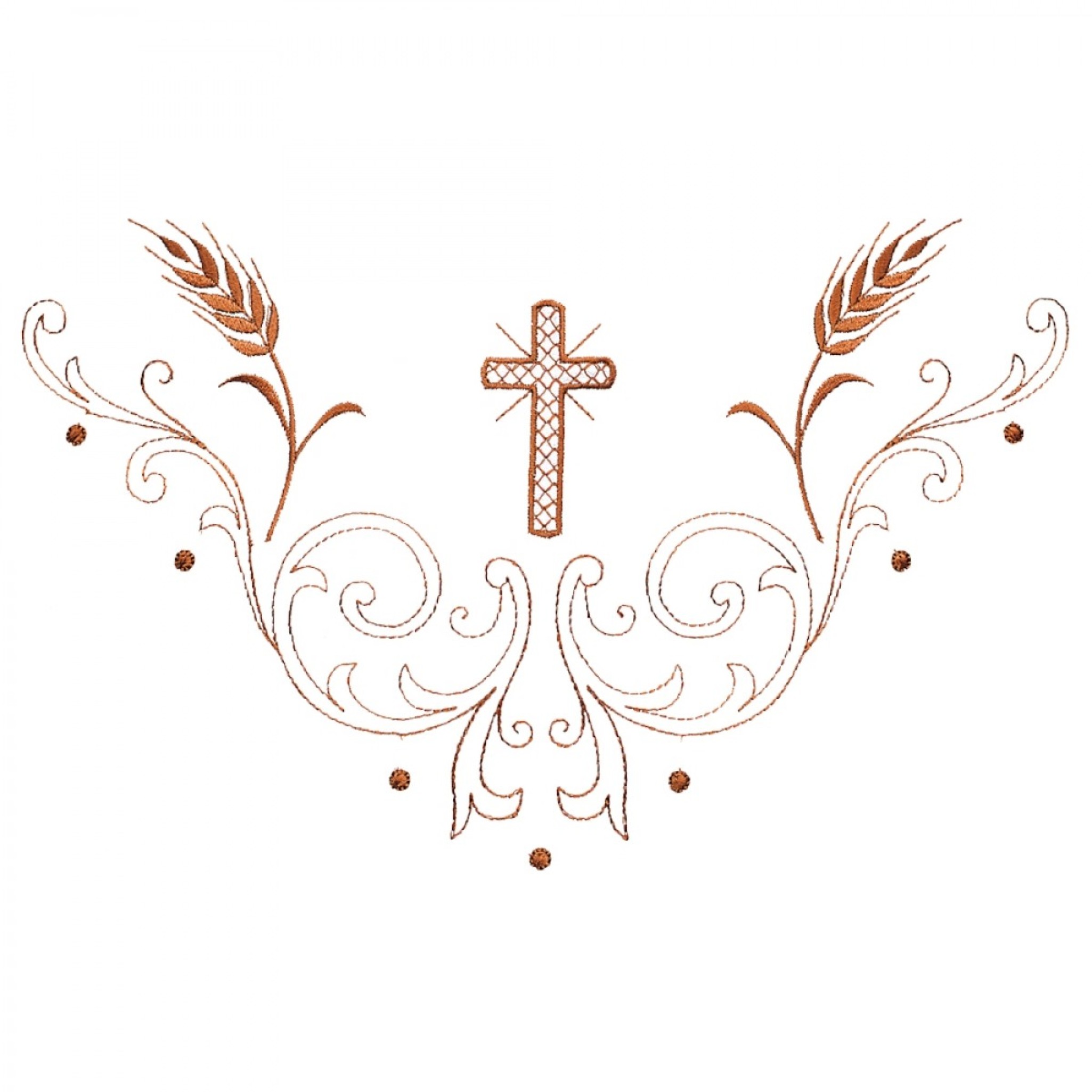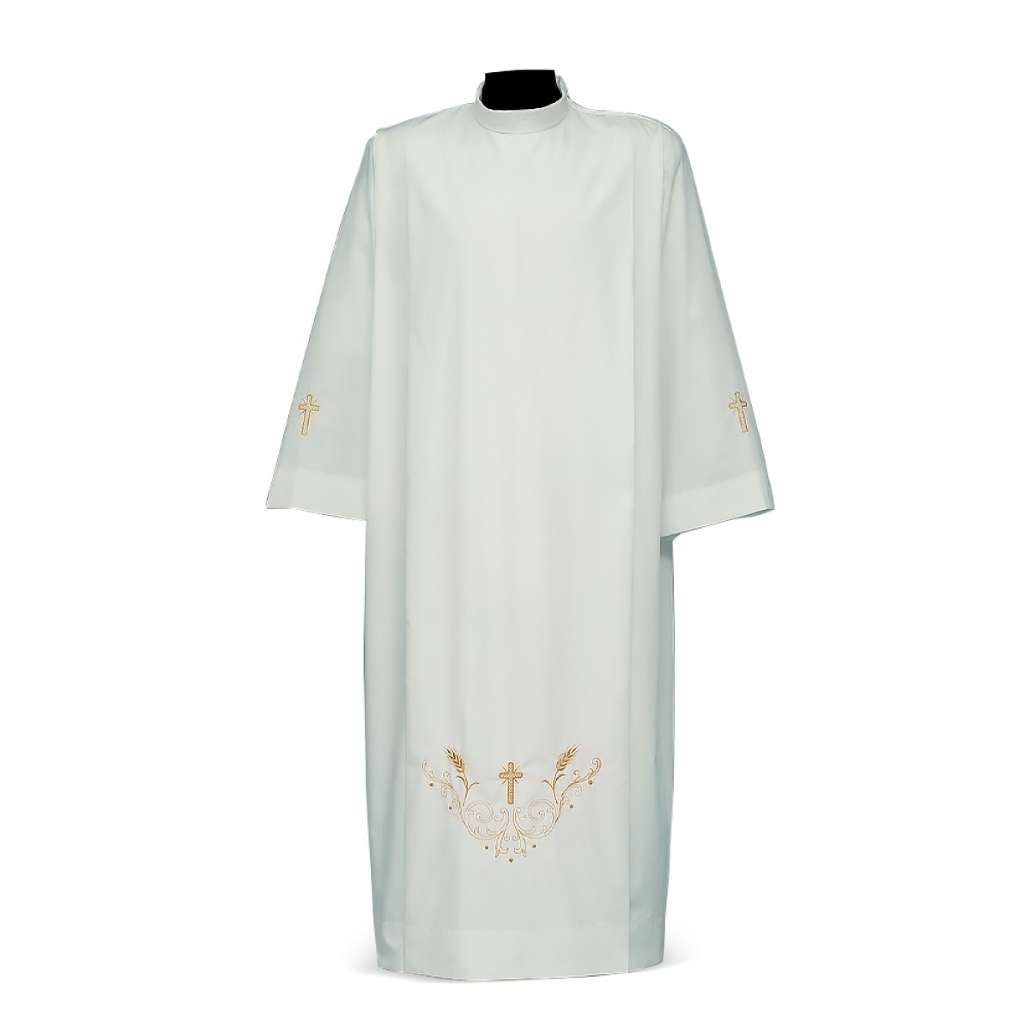 Une aube liturgique en polyester et coton de couleur blanche. Un motif croix et épis de blé est brodé en bas de l'aube liturgique ainsi qu'une croix sur chaque manche. Fermeture éclaire sur l'épaule. Longueur de l'aube liturgique : 145 cm.
