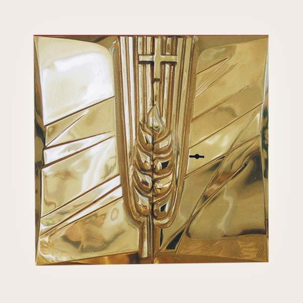 Tabernacle en laiton doré et verni, traité anti-feu. L'intérieur est en laiton doré poli et verni. Fixation sur demande prévu pour pose murale ou poser sur un support.