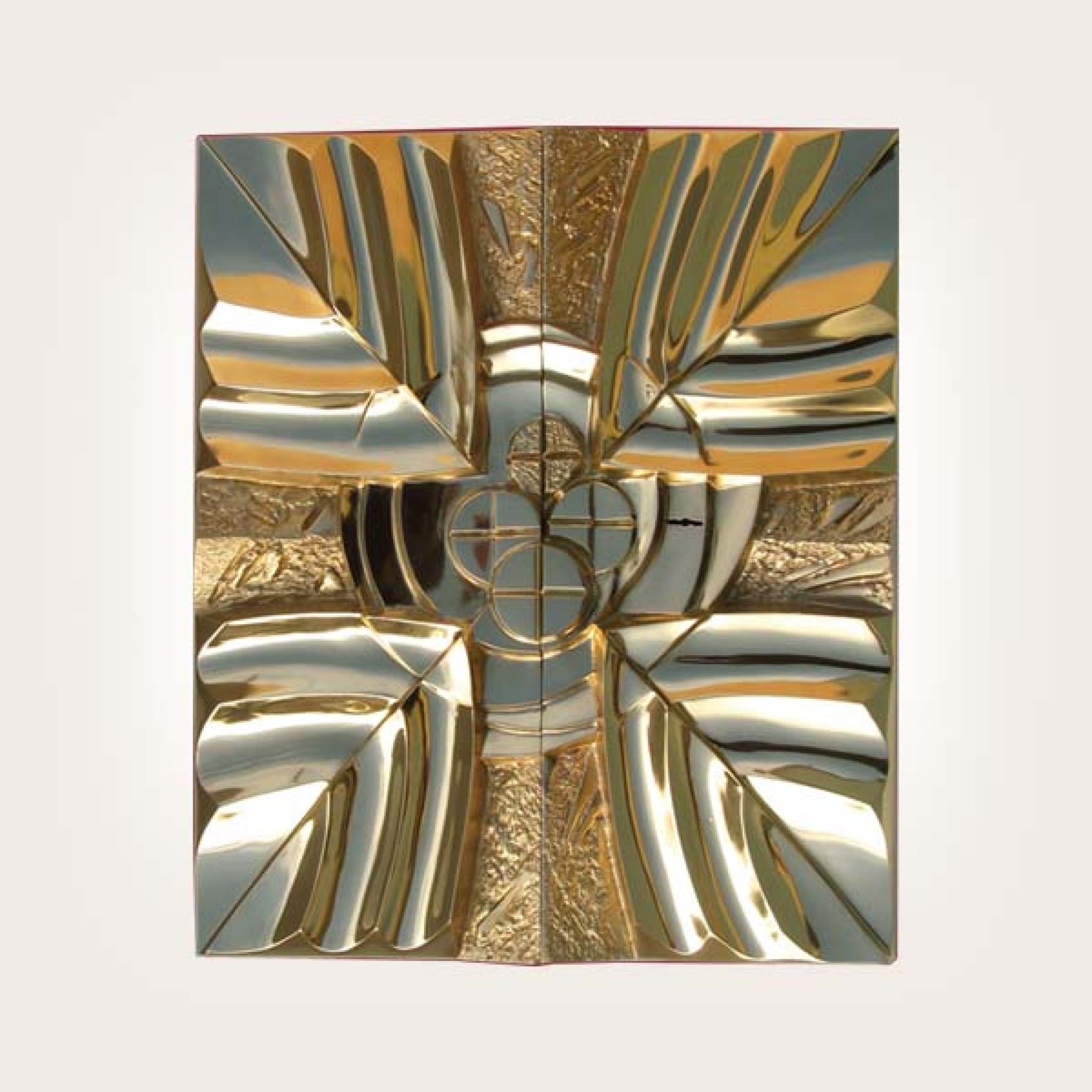 Tabernacle en laiton doré et verni, traité anti-feu. L'intérieur est en laiton doré poli et verni. Fixation sur demande prévu pour pose murale ou poser sur un support.