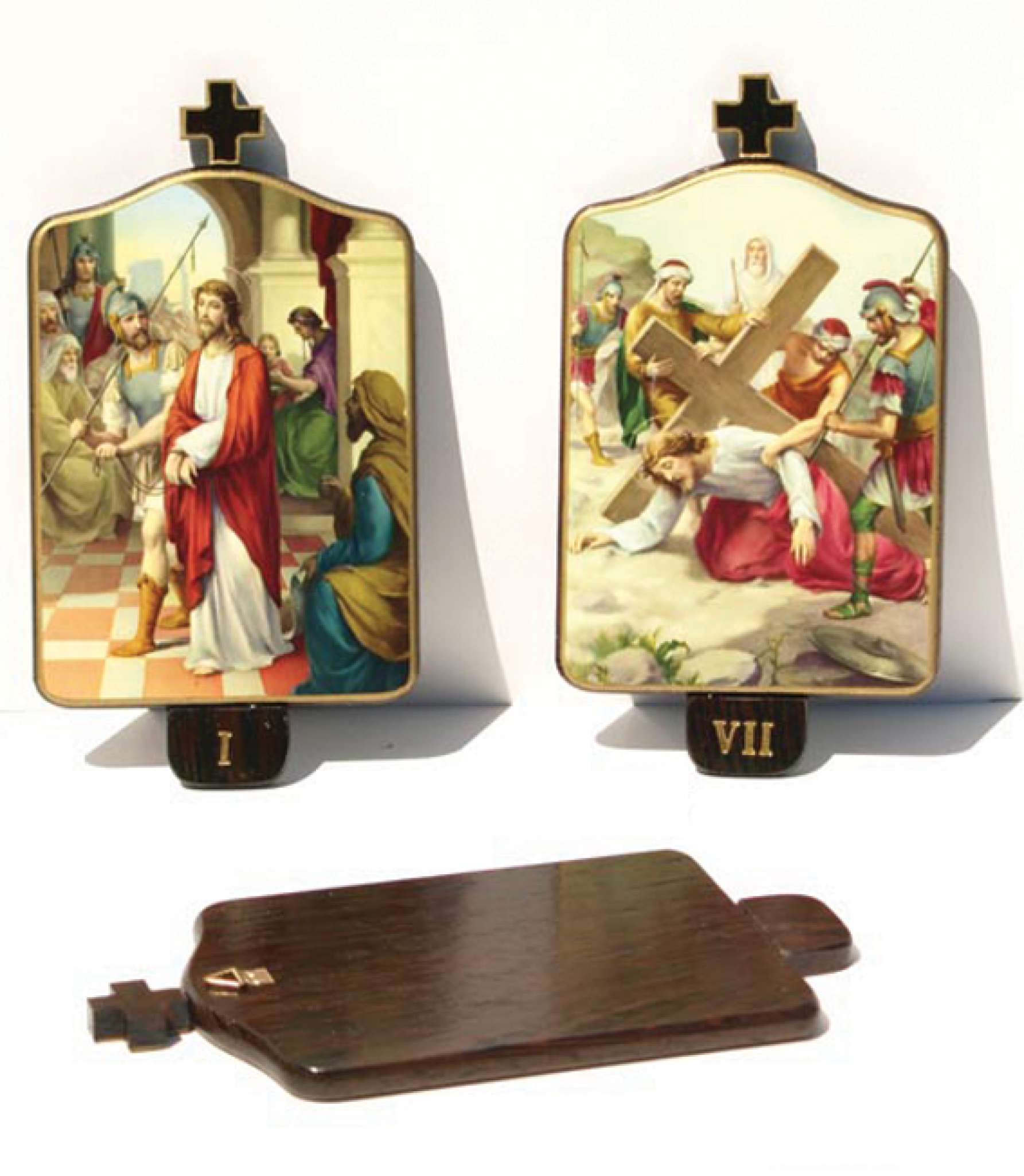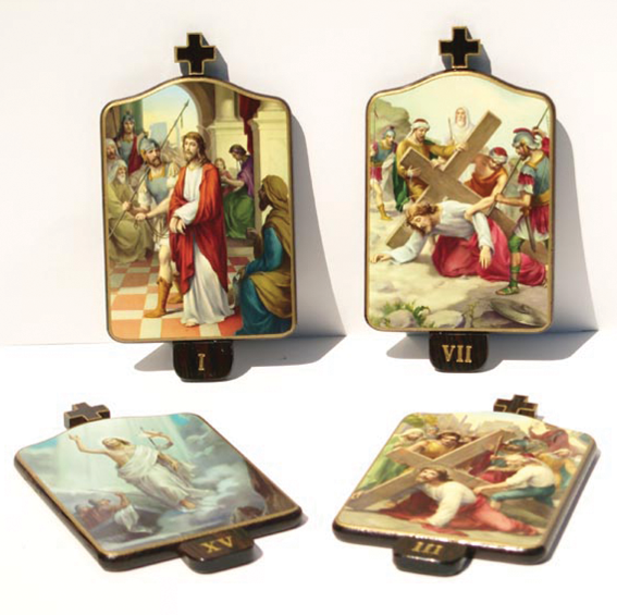 15 stations de 19 cm de haut x 10,5 cm de large. Une petite croix orne le dessus de chaque station. Le chiffre romain de chaque station est doré à chaud sur le bas de chaque station du chemin de croix.