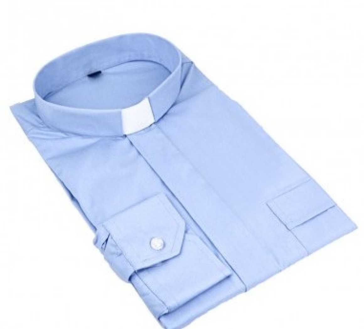 Chemise clergyman 100 % coton de couleur bleue ciel. Taille de la chemise clergyman: XXL (équivalent 45 & 46 en tour de cou) Tour de poitrine 135 cm, longueur de manche 67 cm, longueur de chemise 82 cm. Col plastique clergyman fourni et inséré dans le col. Lavable en machine à 30°, repassage facile.