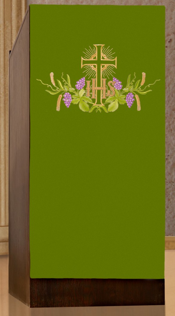 En polyester brodé machine d'une croix, d'un IHS, d'épis de blé et de feuilles de vigne, dimensions 55 cm de large, 2,50 m de longueur.