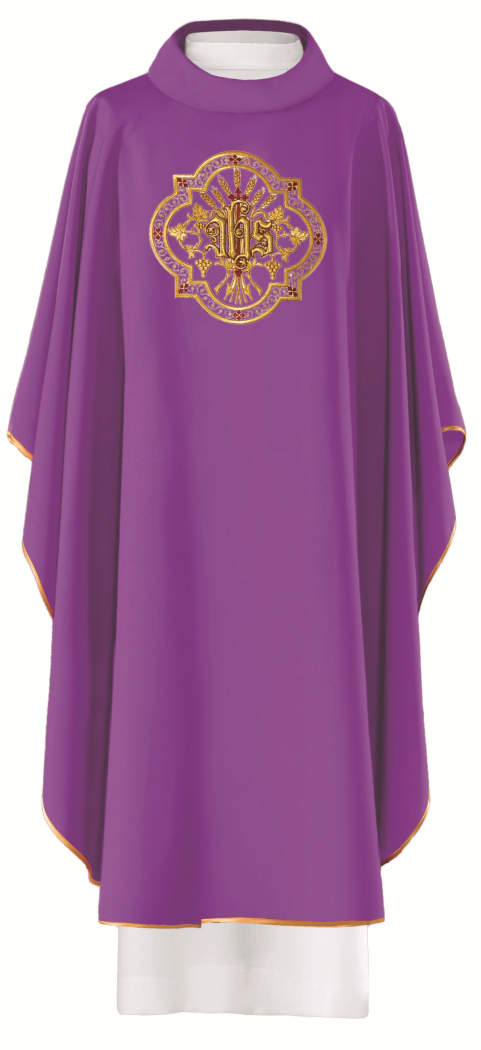 Chasuble violette brodée machine ornée d'un IHS sur le devant et d'un chrisme sur le dos. Chasuble brodée en 100 % polyester. Bordée d'un biais sur le bord de la chasuble. Ornement fourni avec son étole. Coupe gothique pour cet ornement brodé : longueur 130 cm, largeur 150 cm.