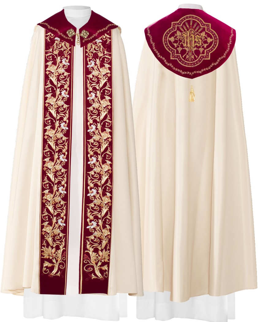 Chape liturgique en polyester brodée devant et dos sur un tissu rouge velour. Un IHS orne le capuchon, des motifs de fleurs ornent