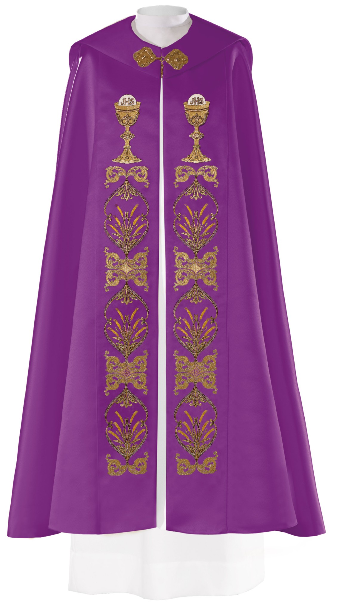 Chape en polyester brodée devant et dos. Deux calices et des broderies ornent la chape. Longueur 145 cm. Chape fournie avec son étole.