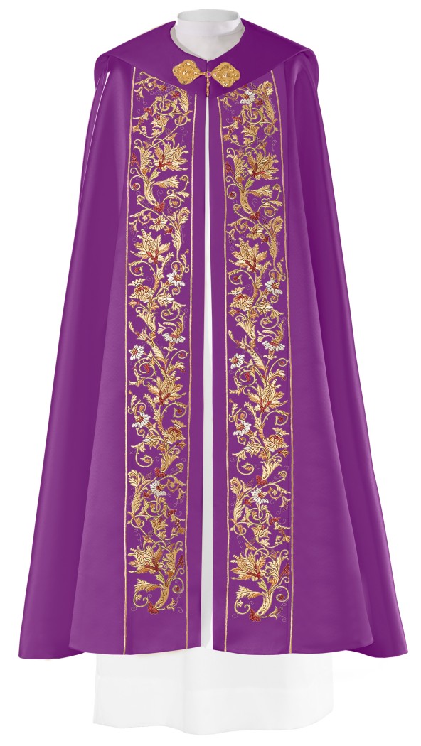Chape en polyester brodée devant et dos. Un Chrisme orne le capuchon et des broderies de volutes et de fleurs ornent la chape. Longueur 145 cm. Chape fournie avec son étole.