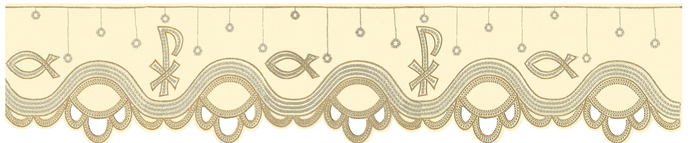 Antependium en polyester brodé de motifs Chiro et de poissons. Hauteur 21 cm, longueur 7 mètres. Pour parer vos autels aux couleurs liturgiques.