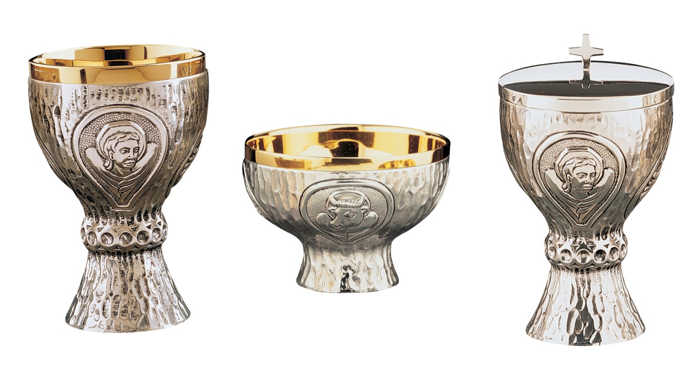 Une parure de vases sacrés dont un calice, un ciboire et une coupe avec sa patène dans un style contemporain. L'ensemble est en laiton argenté, l'intérieur est plaqué or 24 carats. Représentation de 4 symboles évangélistes.