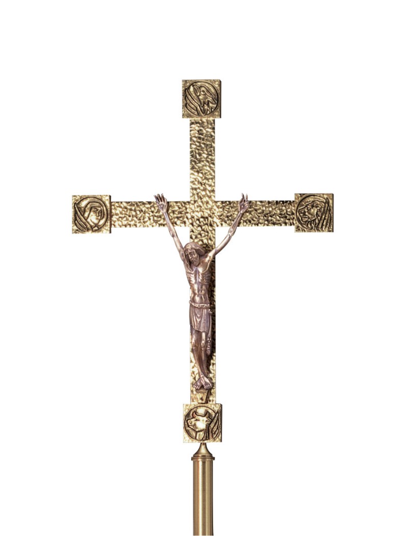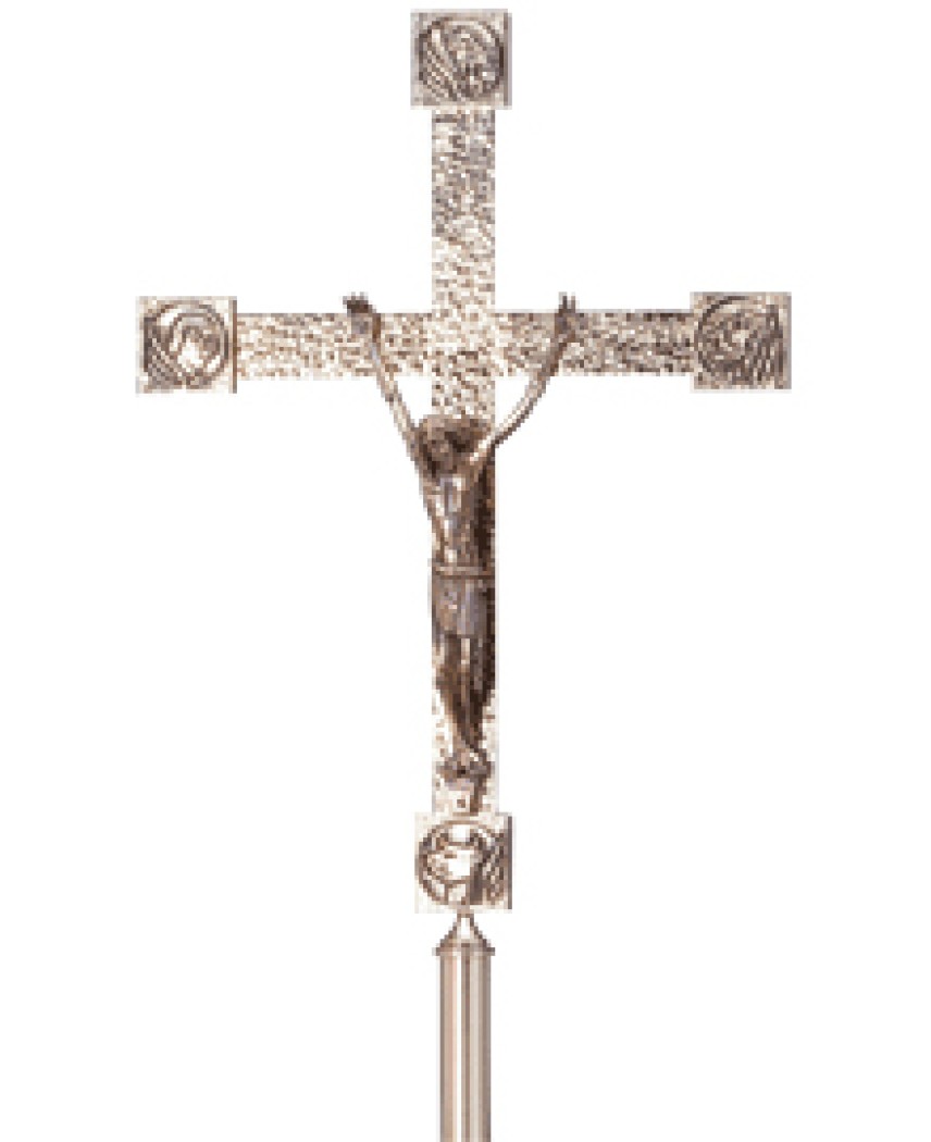 Croix de procession en laiton argenté. Style classique. Cette croix représente les symboles des quatre Évangélistes. La croix a été martelée à la main.