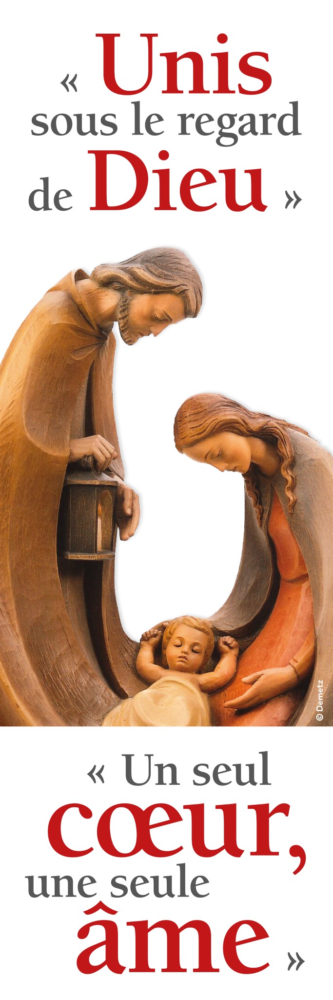 98,40€ TTCBannière en tissu (200 g./ m²) au format 1 x 3 mètres de long. Pour solenniser les mariage, illustrée d'une sainte Famille avec une phrase :" Unis sous le regard de Dieu"'. Finie d'un ourlet ouvert en haut avec une barre avec pommeaux en bois et cordon de suspension.