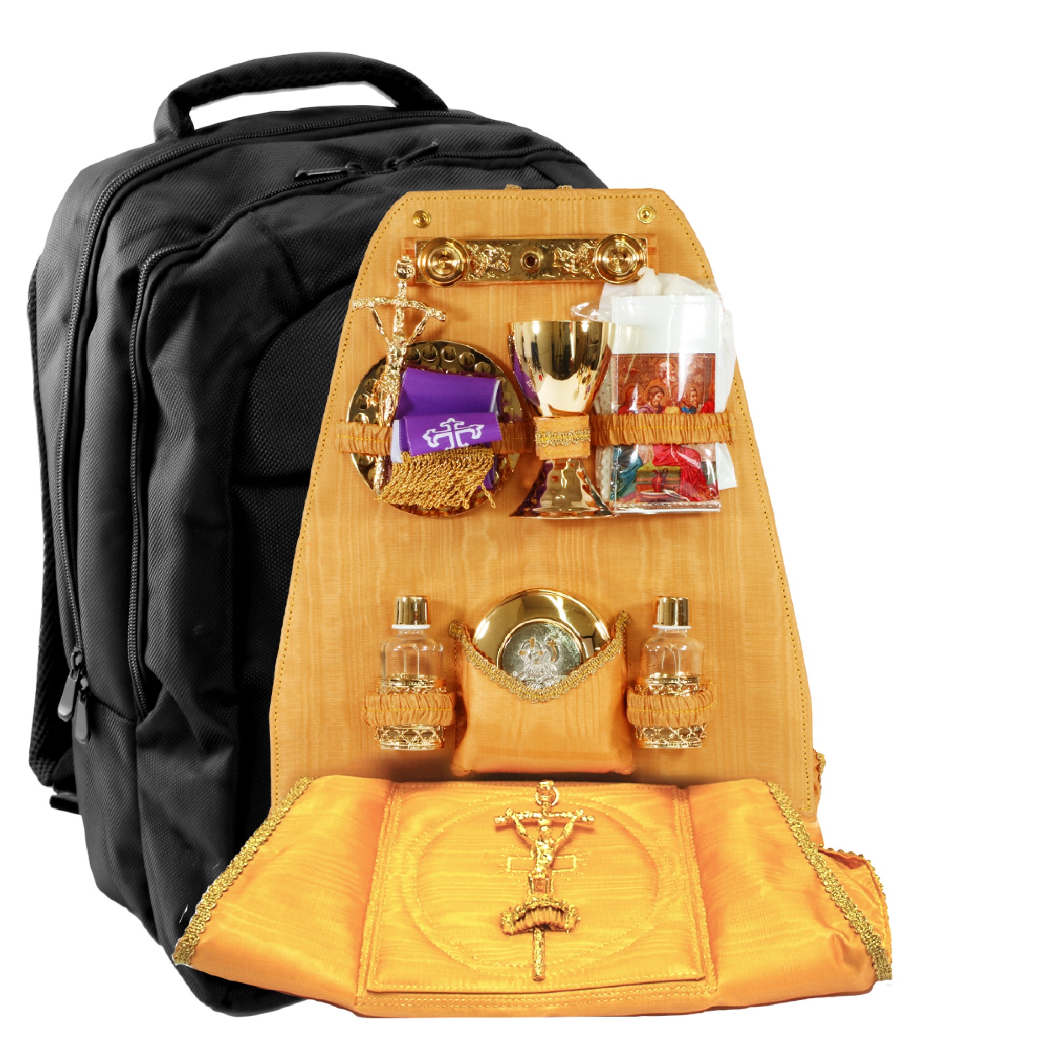 Valise chapelle noire en format sac à dos. Sac à dos en tissu technique et imperméable, avec le dos et les épaules rembourrés. Il est équipé d'un panneau de rangement amovible orné de tissu doré damassé.