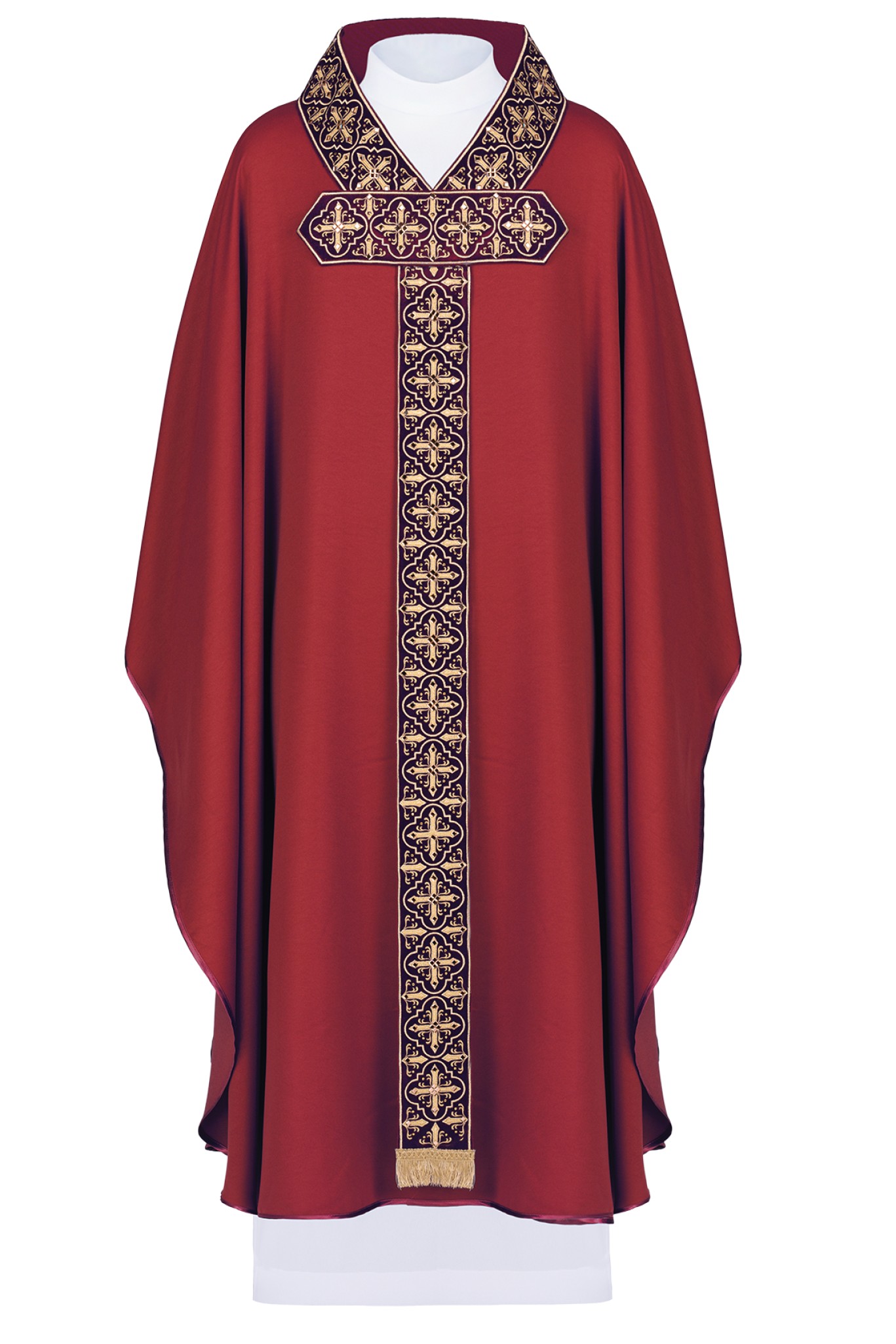 Chasuble brodée sur un galon posé en Tau. Col richement orné. Ornement en polyester (80 %), bamboo (10 %) et microfibre (10%). Galon en velours. Brodée d'un biais sur le bord de la chasuble. Ornement fourni avec son étole. Coupe gothique pour cet ornement brodé : longueur 130 cm, largeur 150 cm.