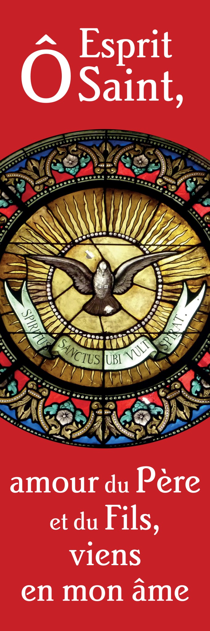 Bannière en tissu (200 g./ m²) au format 1 x 3 mètres de long. Pour solenniser la Pentecôte. Finie d'un ourlet ouvert en haut avec une barre avec pommeaux en bois et cordon de suspension.