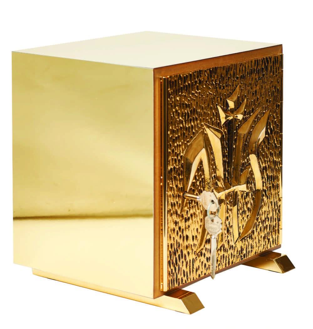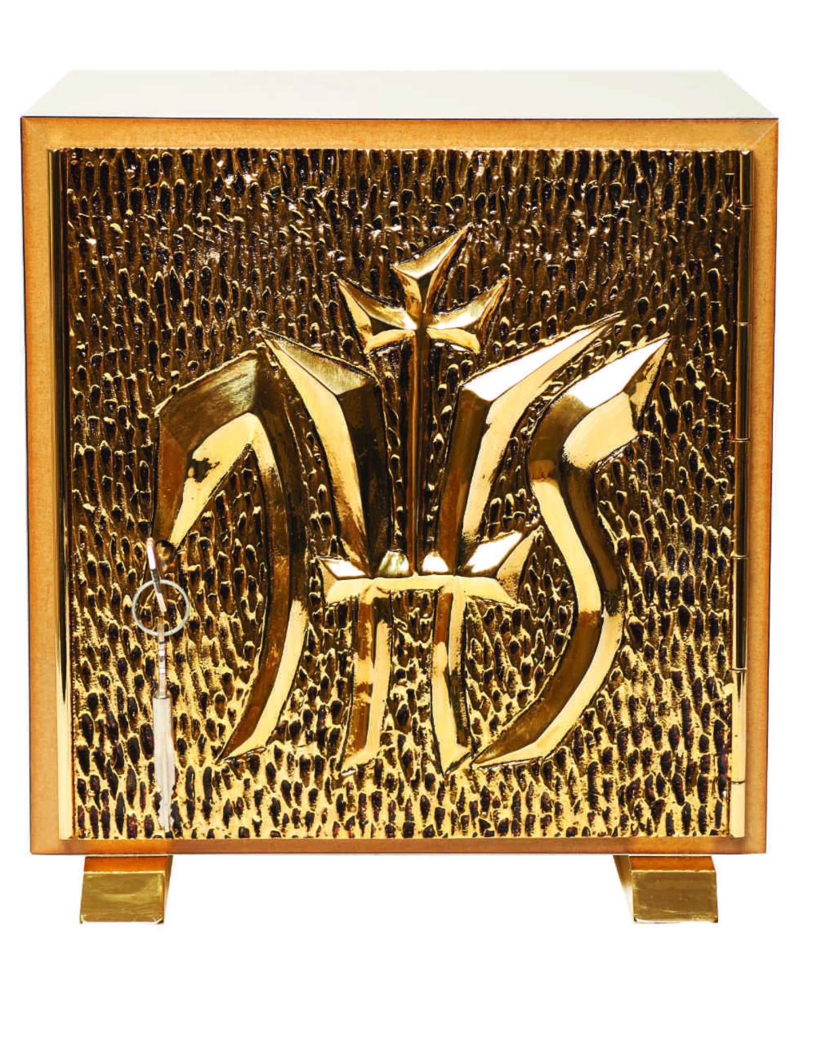 Tabernacle en bois recouvert à l'intérieur de laiton doré et à l'extérieur plaqué de bois. Porte recouverte de laiton orné d'un motif bon pasteur. Dimensions extérieures 26 cm x 28 cm et profondeur de 23 cm. Dimensions intérieures 22,5 cm x 22,5 cm et profondeur 18 cm.