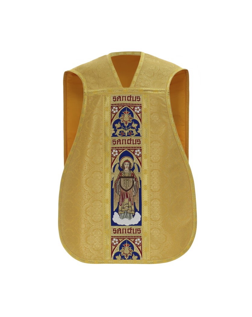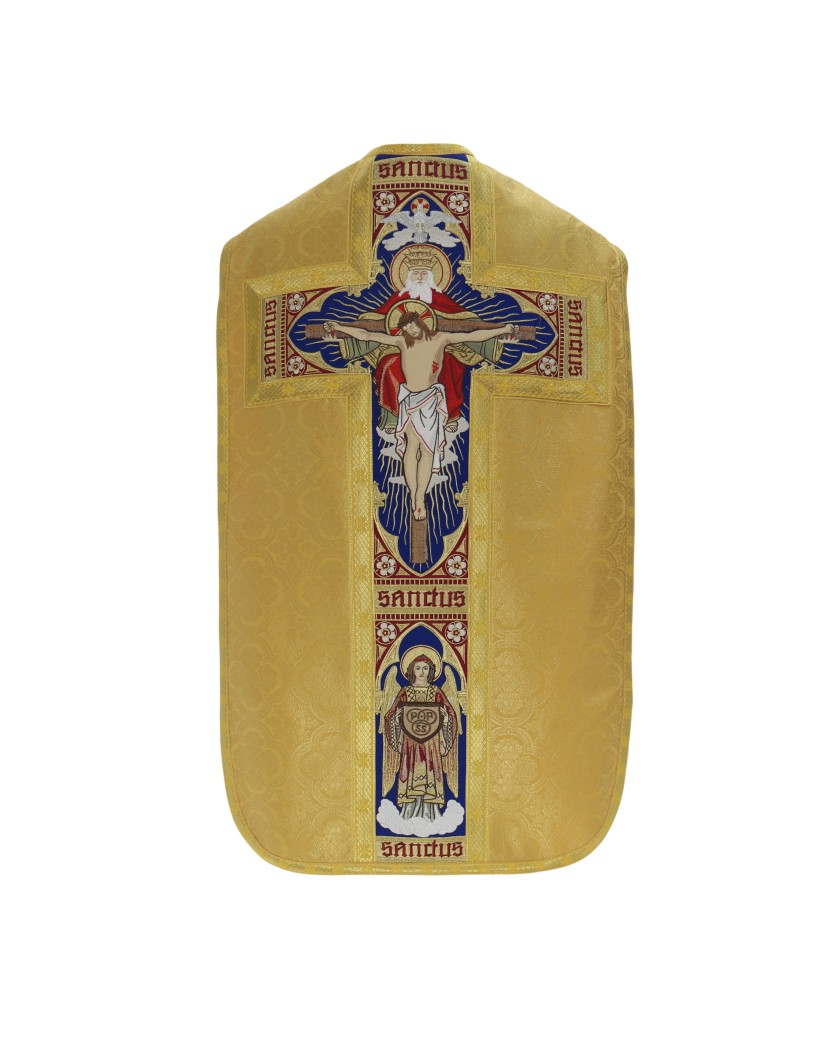 Chasuble romaine en polyester damassé, ornement doublé. Orné devant d'un ange et au dos de la sainte Trinité. Longueur 105 cm, largeur aux épaules 62 cm. Fournie avec son voile de calice, son étole, sa bourse (format 16 x 16 cm sans soufflet), son voile de calice (format 50 x 50 cm) et son manipule.