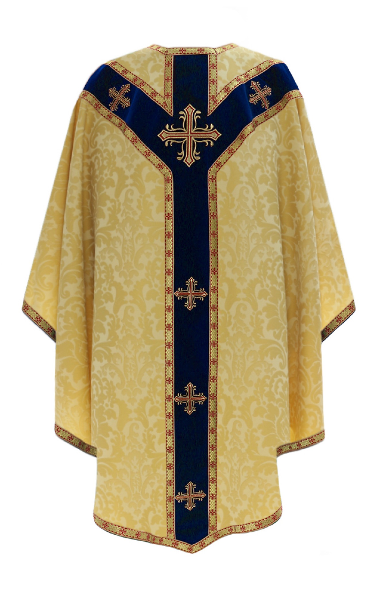Chasuble coupe gothique en polyester damassé doré. Ornée d'un orfroi en velours bleu brodé de croix. Longueur de l'ornement sacerdotal 130 cm, largeur 154 cm. Chasuble fournie avec son étole.
