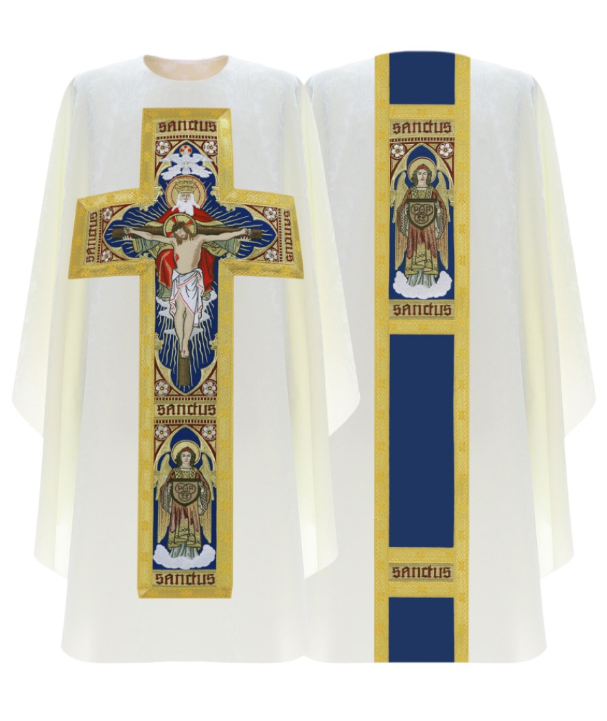 Chasuble coupe gothique en polyester damassé blanche. Ornée d'un orfroi en velours brodé en forme de de croix devant et d'une bande au dos. Le galon représente la trinité devant et un ange au dos. Longueur de l'ornement sacerdotal 130 cm, largeur 154 cm. Chasuble fournie avec son étole.