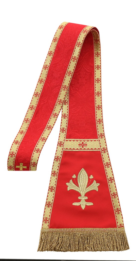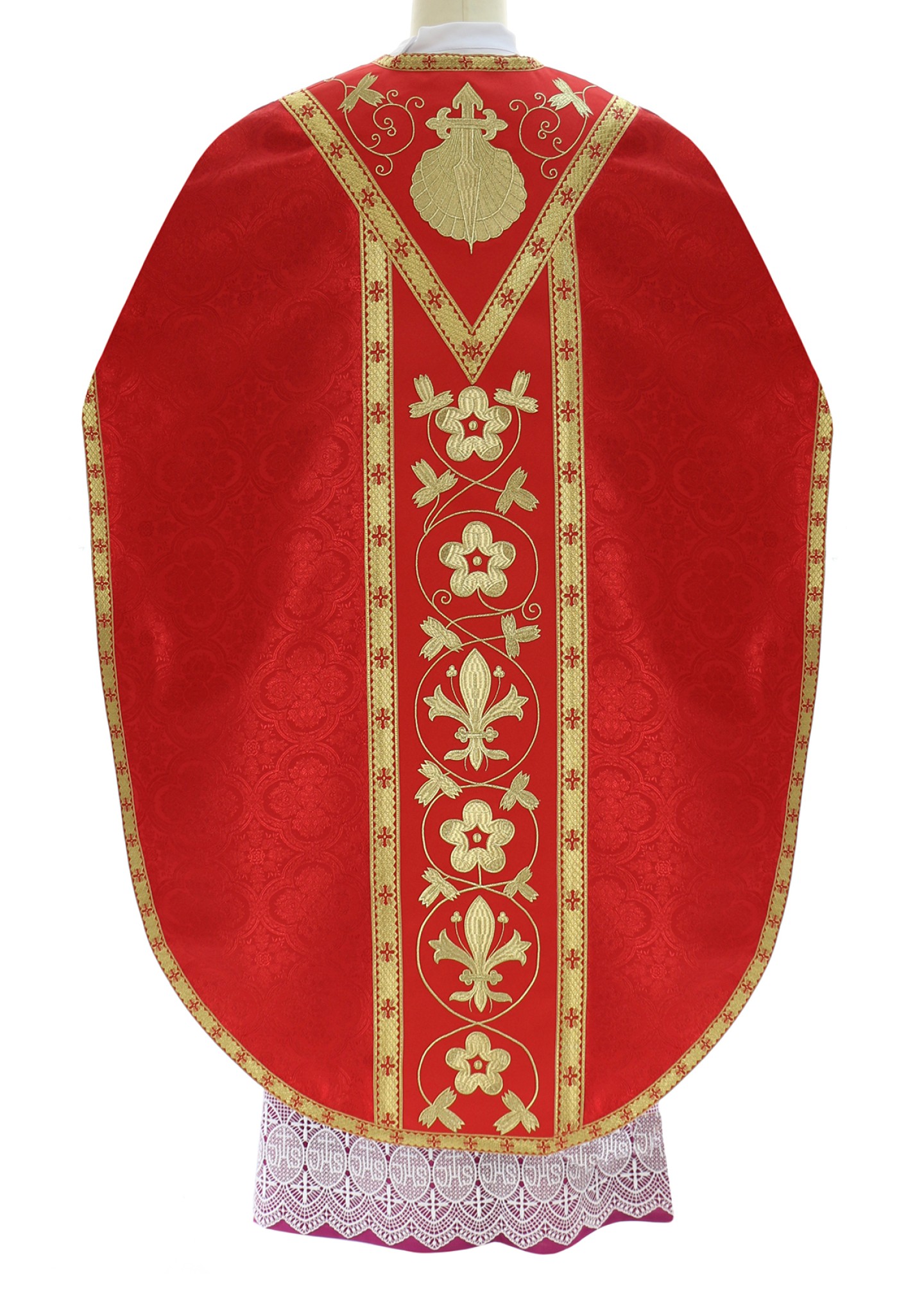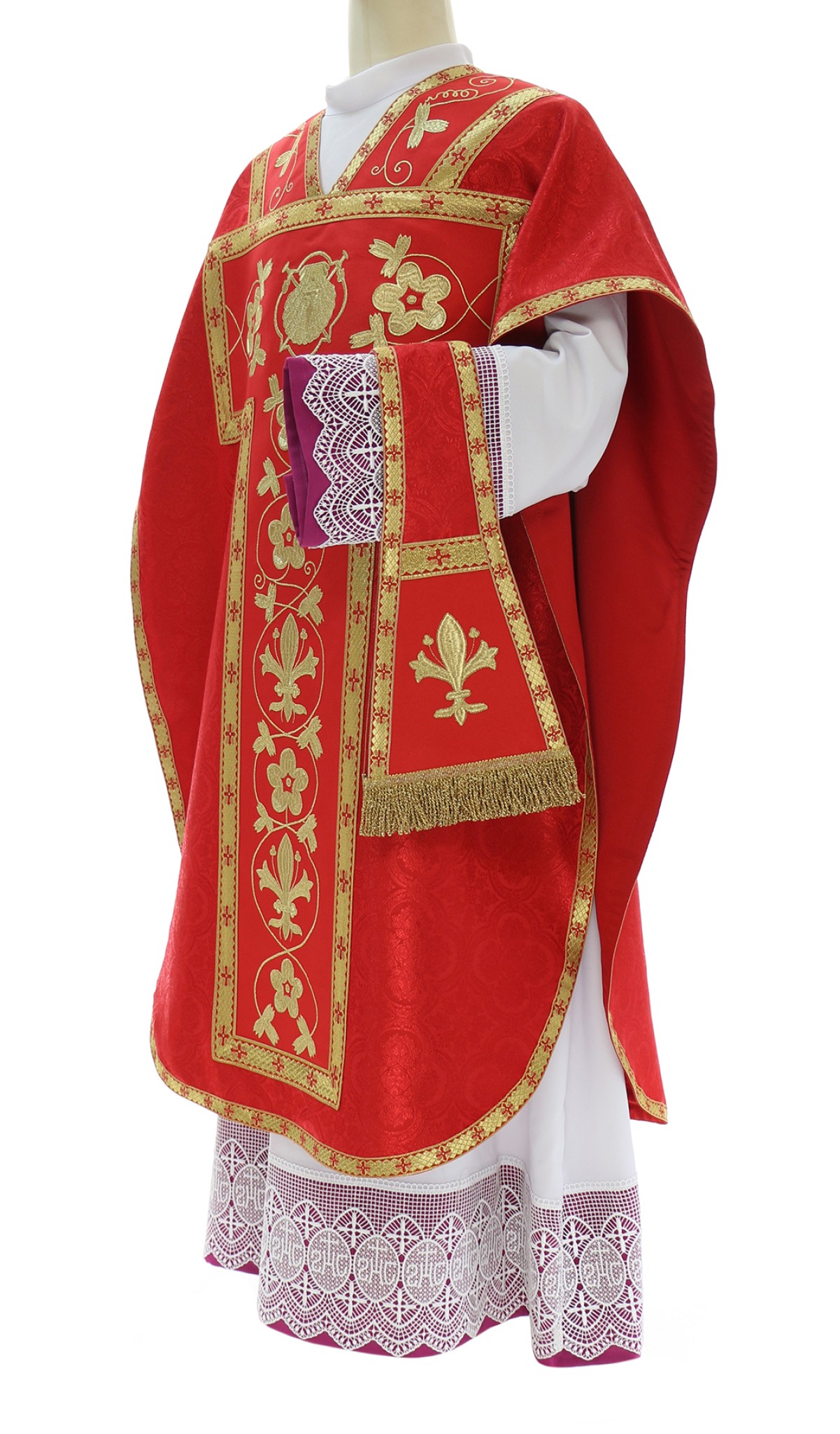 Chasuble coupe dit Saint Philippe Néri en polyester damassé rouge.