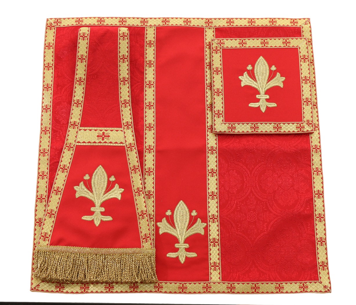 Longueur 122 cm, largeur aux épaules 95 cm. Fournie avec son voile de calice, son étole, sa bourse (format 16 x 16 cm sans soufflet), son voile de calice (format 50 x 50 cm) et son manipule.