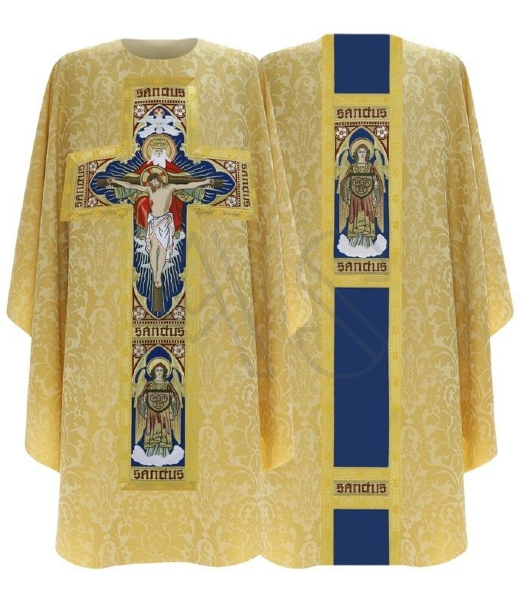 Chasuble coupe gothique en polyester damassé dorée. Ornée d'un orfroi en velours brodé en forme de de croix devant et d'une bande au dos. Le galon représente la trinité devant et un ange au dos. Longueur de l'ornement sacerdotal 130 cm, largeur 154 cm. Chasuble fournie avec son étole.