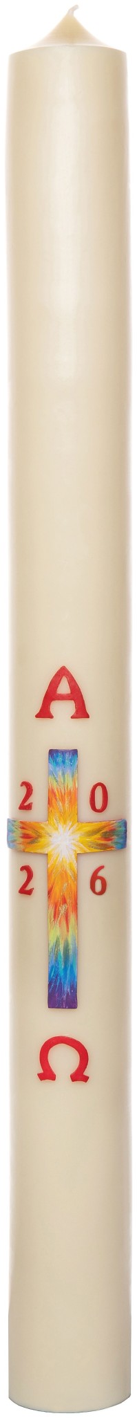Procédé traditionnel de fabrication pour ce cierge pascal qui manifestera la lumière de la résurrection pendant la veillée Pascale. Chacun des angles du cierge pascal formés par les bras de la croix sont inscrits un des quatre chiffres du millésime de l'année. Au-dessus et au-dessous de la croix, la première lettre (Alpha) et la dernière lettre (Omega) de l'alphabet grec sont inscrites, manifestant que le Christ est "commencement et fin de toutes choses"